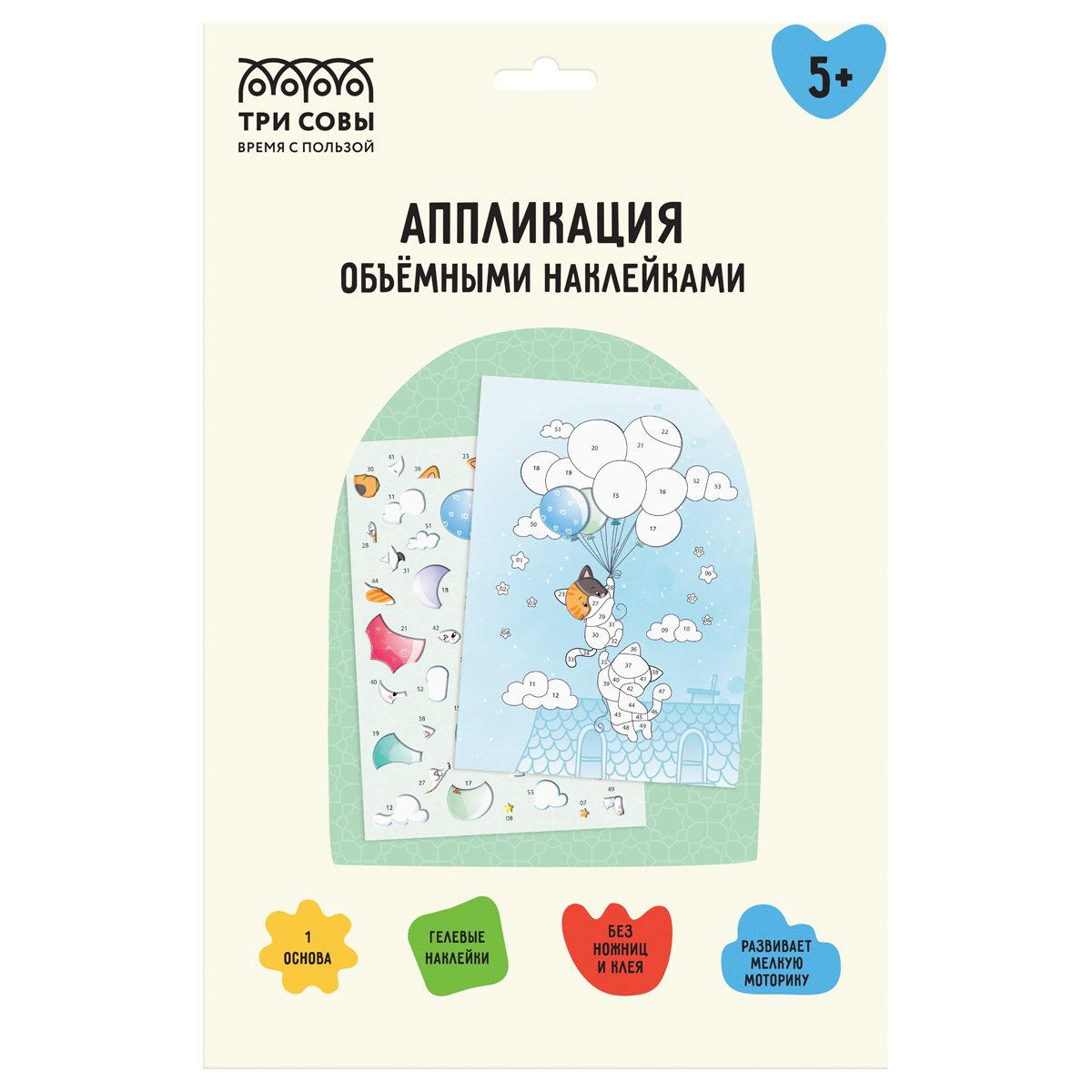 Набор для детского творчества «Аппликация наклейками» бренда «ТРИ СОВЫ» позволит ребенку с удовольствием и пользой провести время. Для создания аппликации «Котики» не потребуется клея и ножниц. В набор входят: - 1 основа для аппликации из плотного картона - 1 блок с объемными наклейками Рекомендации по работе с набором: шаг 1 - подготовить рабочее место; шаг 2 - выбрать и отклеить элемент аппликации от блока с наклейками; шаг 3 - найти на основе-картинке область с такой же цифрой и приклеить элемент. Наклеенные на основу элементы создадут яркую и интересную картину, которую можно подарить близкому человеку или украсить комнату. Работая с аппликацией, ребенок активно развивает мелкую моторику, восприятие цвета и формы, пространственное и образно-логическое мышление, концентрацию внимания. «ТРИ СОВЫ» – время с пользой!