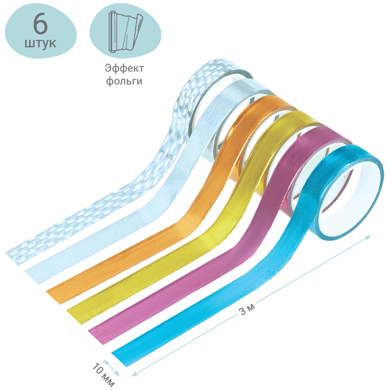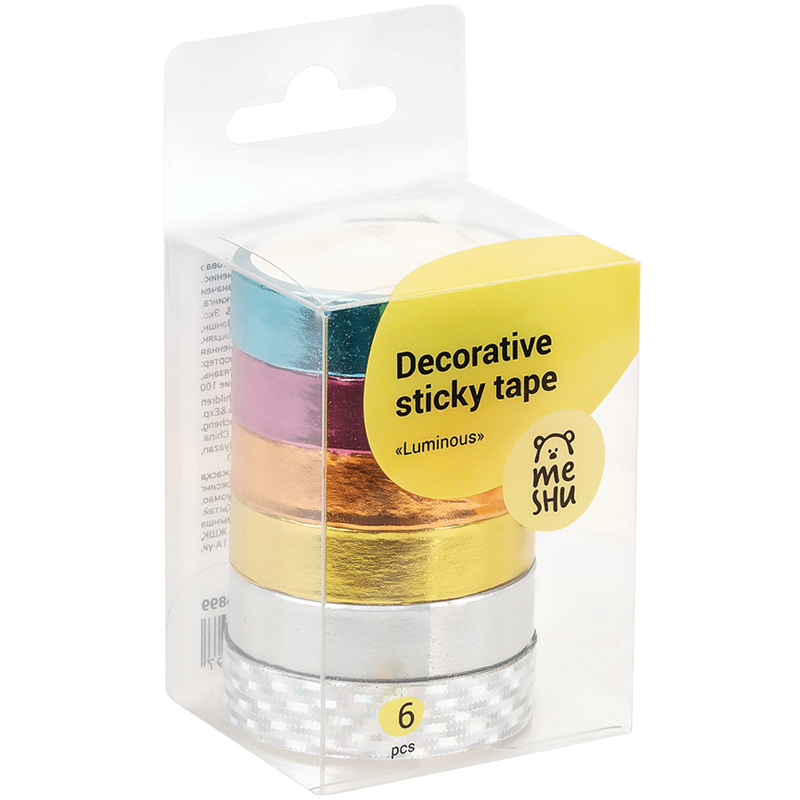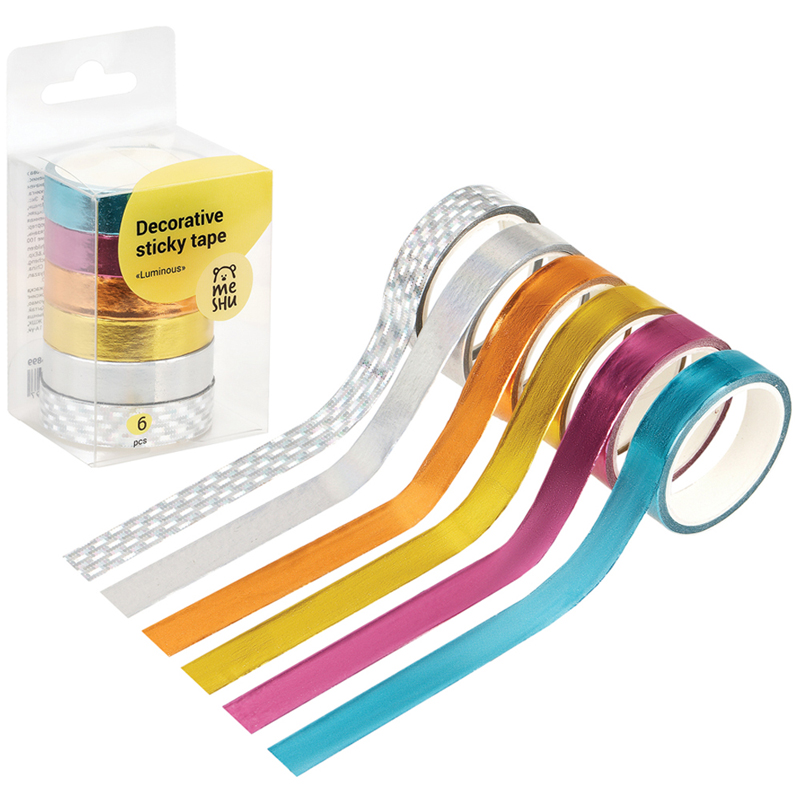 Декоративные клейкие ленты MESHU предназначены для упаковки подарков, оформления поделок, элементов интерьера и скрапбукинга. Открытки, альбомы, ежедневники, подставки, цветочные горшки, подсвечники, рамки и много другое может преобразиться с декоративными лентами MESHU. Яркие и современные дизайны сделают процесс творчества увлекательным, а результат впечатляющим. А качественная клеевая основа позволит надёжно зафиксировать ленту и быть уверенным в долговечности декора. • Ширина ленты: 15 мм; • Длина намотки: 3000 мм; • Материал: бумага; • Количество в наборе: 6.