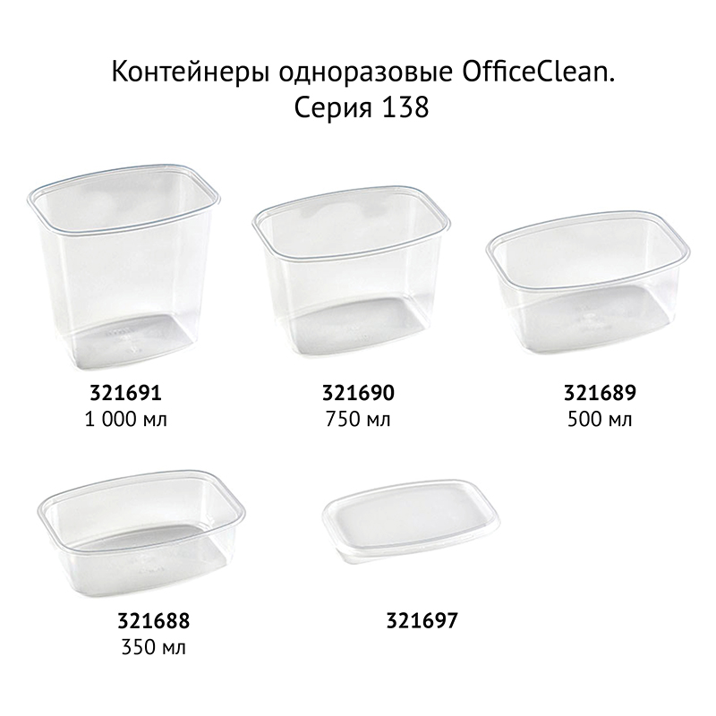 Крышка для одноразовых контейнеров OfficeClean из полипропилена. Подходит к контейнерам код 321688, 321689, 321690, 321691. Материал крышки безопасен для горячих продуктов и повторного разогрева в СВЧ. Размер крышки: длина - 138 мм, ширина - 102 мм, высота - 5 мм. Вес - 3 гр.