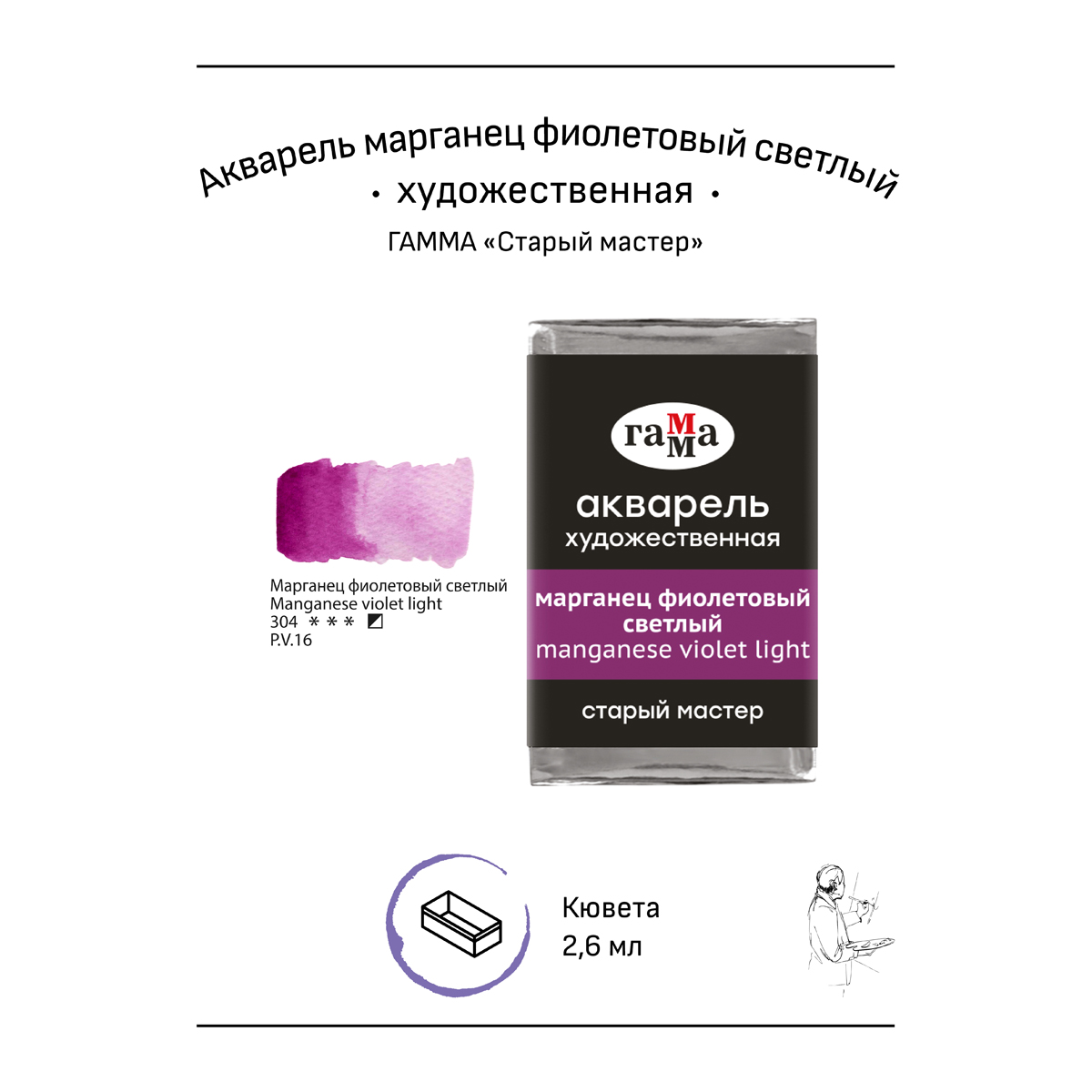 Профессиональная художественная акварель ГАММА серии «Старый мастер» упакована в новую кювету объёмом 2,6 мл. Цвет краски – марганец фиолетовый светлый. Рецептура профессиональной художественной акварели «Старый мастер» разработана в собственной исследовательской лаборатории завода. В составе красок гуммиарабик высшей степени очистки и высококачественные пигменты, которые обеспечивают насыщенность цветов, чистоту и прозрачность красочного слоя. Каждая кювета упакована в плёнку. • Цвет: марганец фиолетовый светлый; • Упаковка: кювета; • Объем кюветы: 2,6 мл.
