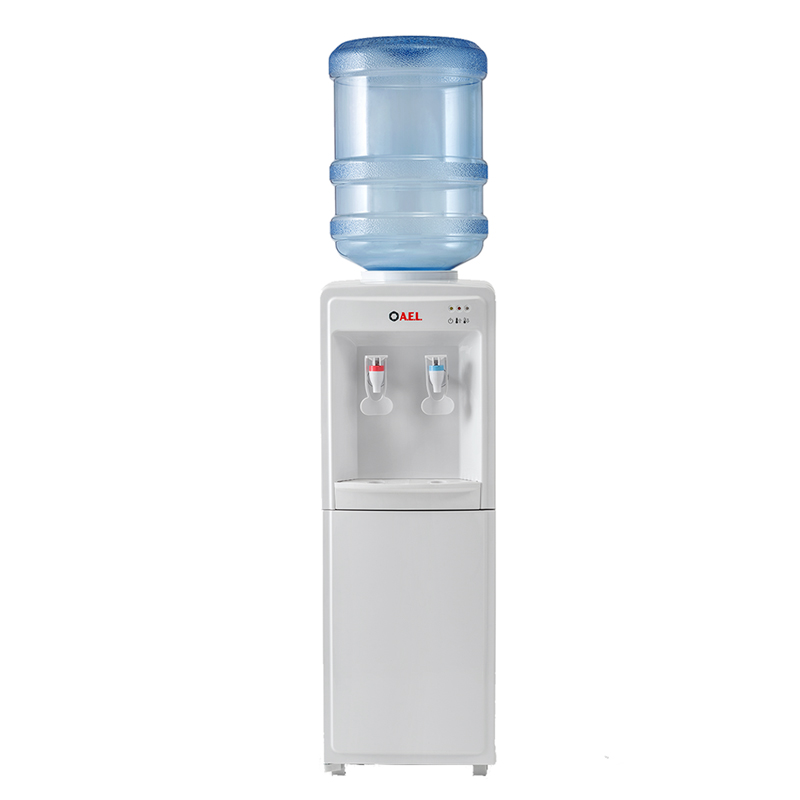 Напольный кулер для воды с верхней загрузкой бутыли в корпусе черного цвета с серебристыми вставками. Аппарат имеет два удобных крана для подачи воды типа "нажим кружкой". Краны с внутренней резьбой для удобной замены в случае необходимости. Оснащен встроенным шкафчиком объемом 10 литров (140х230х325 мм). Кулер с электронной системой охлаждения. Производительность - 0,7 л холодной и 5 л горячей воды в час.