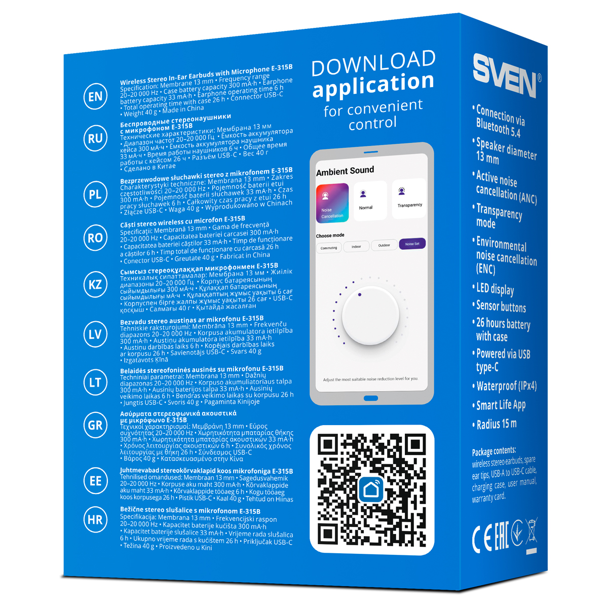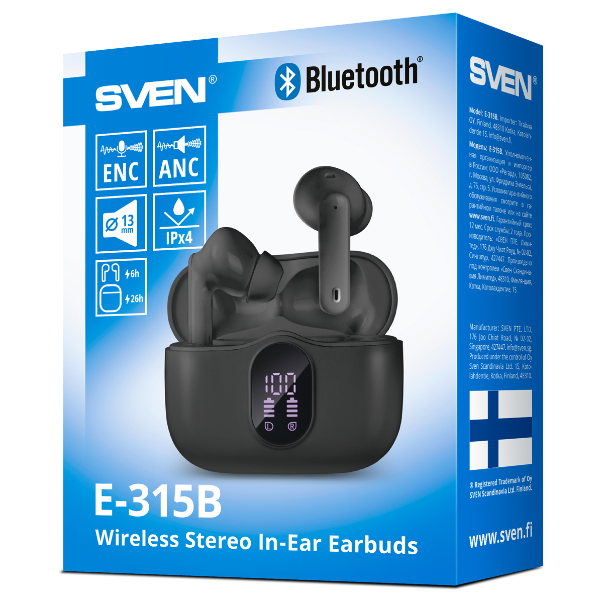 С первого взгляда становится ясно, что перед нами максимально «заряженное» устройство, у которого есть абсолютно все — даже собственный LED-дисплей с индикацией заряда на лицевой стороне кейса. Дизайн при этом выдержан в максимально строгом и лаконичном стиле, что позволит наушникам органично сочетаться с любым стилем одежды. Один из главных признаков по-настоящему флагманских наушников – это, конечно, наличие приложения для мобильных гаджетов, которое дает доступ ко всем параметрам и настройкам. SVEN E-315B поддерживают управление через ПО Smart Life, предлагаемое в версиях для устройств под управлением iOS и Android. С его помощью можно полностью управлять гарнитурой, используя удобный и понятный интерфейс – все настройки всегда под рукой в смартфоне пользователя. В частности, с помощью Smart Life можно настроить звучание под свой вкус и настроение с помощью встроенного эквалайзера, управлять воспроизведением музыки, выбирать режимы шумоподавления, а также включать «игровой режим», помогающий снизить задержку, добиться идеальной синхронизации изображения и звука как в играх, так и при просмотре видео. Отдельного упоминания заслуживает функция поиска, которая может выручить владельцев SVEN E-315B в сложной ситуации. Найти потерянные где-то в помещении наушники можно с помощью воспроизводимого ими высокочастотного сигнала, который хорошо слышен. Ну а если наушники забыты где-то вне дома, поможет возможность отображения их последнего положения на карте. Форма наушников обеспечивает максимально комфортное ношение. При этом, на удобстве сделан особый акцент — сенсорные кнопки управления поддерживают не только управление воспроизведением, но и регулирование громкости. Подумали разработчики и о тех пользователях, которые привыкли слушать музыку во время разного рода активностей — наушники защищены от водяных брызг и капель пота (IPx4), а потому могут использоваться даже на самой тяжелой тренировке или пробежке под легким дождем. Подключение гарнитуры к другим гаджетам осуществляется с помощью современного Bluetooth 5.4, а за звук в них отвечают крупные динамики диаметром 13 мм — такое редко встречается даже в самых передовых на сегодняшний день решениях. Они позволяют наушникам выдавать звук премиального уровня и обеспечивать качественное звучание в широком частотном диапазоне, в том числе — воспроизводить плотный и яркий бас. Максимальное погружение в воспроизводимый материал обеспечивает система активного шумоподавления (ANC) с несколькими режимами работы, позволяющими комфортно слушать музыку или подкасты на средней громкости как посреди большого офиса, так и в шумном общественном транспорте. Контролировать происходящее вокруг, быстро пообщаться с кем-нибудь или услышать нужную информацию поможет режим «звуковой прозрачности», в котором микрофоны гарнитуры транслируют окружающие звуки в динамики. У микрофонов есть собственная система шумоподавления (ENC), которая позволит без проблем общаться по телефону и записывать голосовые сообщения даже в шумной обстановке. Встроенные аккумуляторы внутриканальных наушников позволяют им работать до 6 часов от одного заряда — хватит и на тренировку, и на дорогу на работу. При этом периодическая подзарядка от кейса позволяет достичь общей автономности до 26 часов — часто заряжать SVEN E-315B не при