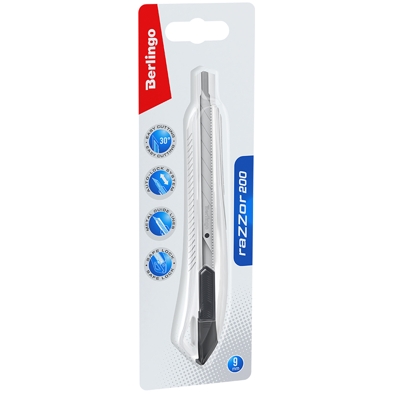 Серия "Razzor 200". Нож канцелярский с системой автоматической фиксации лезвия auto-lock. Корпус ножа выполнен из высококачественного ABS пластика. Имеет металлические направляющие. Комплектуется износостойким лезвием из стали SK5 с углом 30°. Ширина лезвия - 9 мм. Индивидуальная упаковка - блистер с европодвесом. На оборотной стороне блистера есть перфорация для более удобного извлечения инструмента из упаковки.