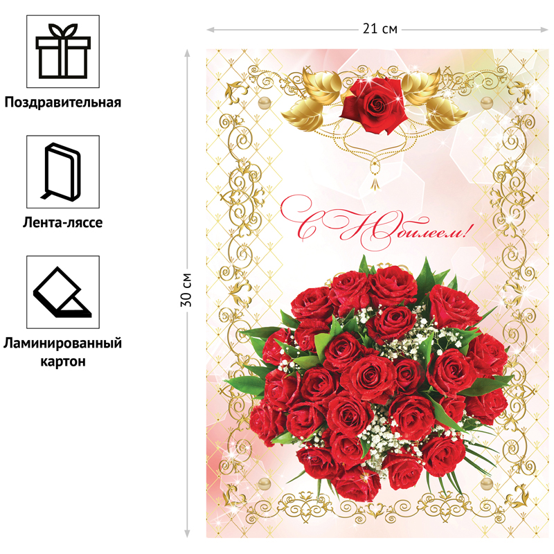 Папка адресная OfficeSpace серии «С юбилеем» формата А4 идеально подойдёт для поздравления с юбилеем. Товар изготовлен из плотного картона с покрытием из ламинированной бумаги. Яркий дизайн поднимет настроение и привлечёт внимание. Внутренний способ крепления документов – лента-ляссе. Размер: 220*310 мм. Папка выпускается в индивидуальной упаковке. • Формат: А4; • Материал обложки: ламинированный картон; • Способ фиксации документов: лента-ляссе; • Цвет: рисунок.