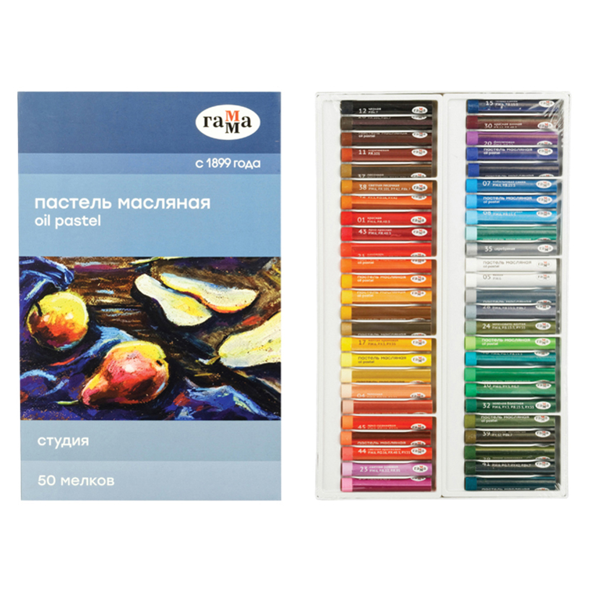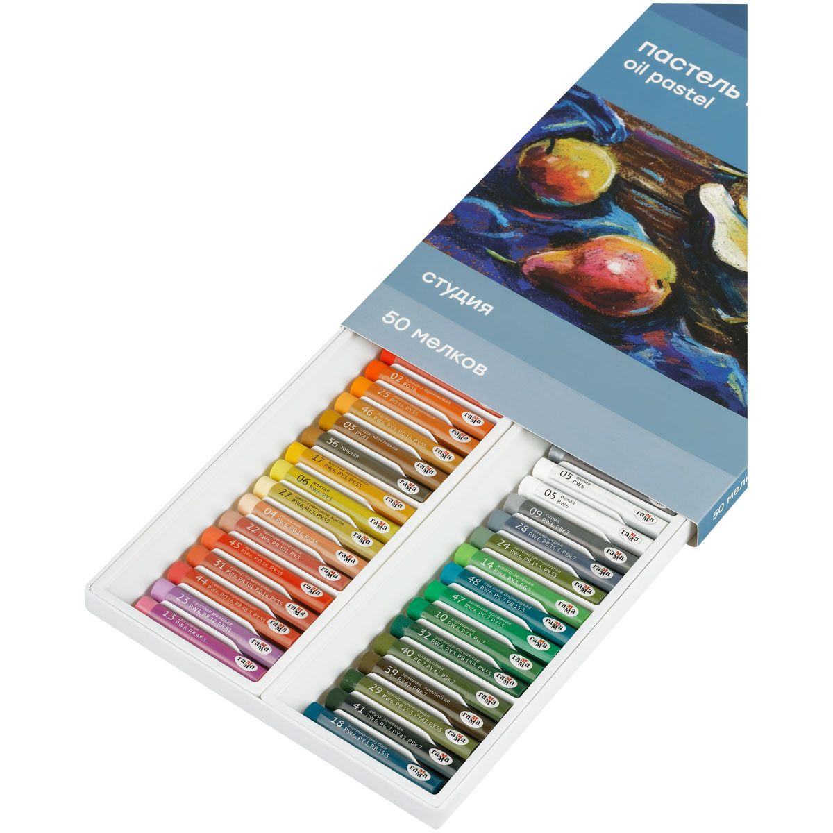 Масляная пастель «Студия» изготовлена на основе тонкотертых пигментов и минерального масла. Оставляет мягкий штрих, легко растушевывается. Яркие насыщенные цвета легко смешиваются, не светлеют и не темнеют со временем. Масляная пастель рисует на поверхностях разных фактур, не осыпается и не требует использования закрепителя краски.