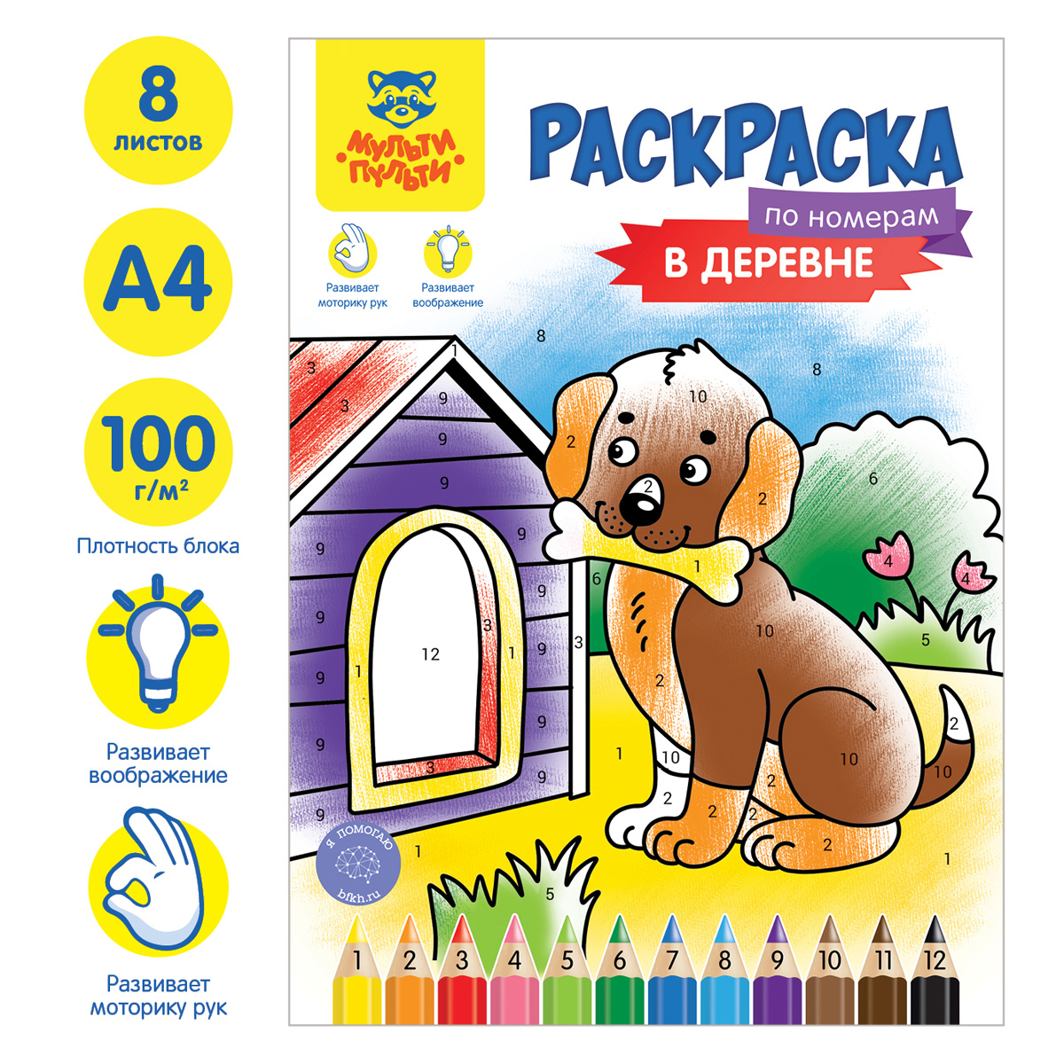 Раскраска бренда «Мульти-Пульти» – незаменимый помощник в творческом развитии ребёнка. Раскраска «Мульти-Пульти» содержит пронумерованные области для раскрашивания. Каждый цифра соответствует номеру цвета, указанному на обложке раскраски. Ребенок может раскрасить сюжет предлагаемыми цветами или придумать свою цветовую гамму для каждого номера. Раскраска имеет размер 210*290 мм и состоит из 16 страниц. Внутренний блок – офсетная бумага плотностью 100 г/кв. м. Раскрашивание развивает мелкую моторику, воображение, способствует формированию цветового восприятия ребёнка. Товар не имеет возрастных ограничений. • Тип: по номерам; • Формат: А4; • Количество листов: 8; • Тип скрепления: скрепка.