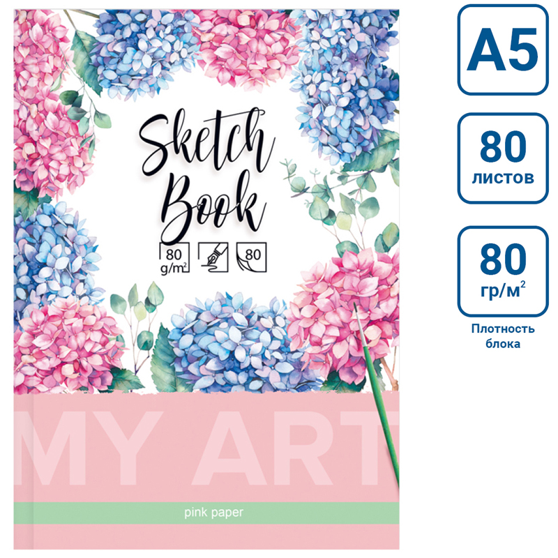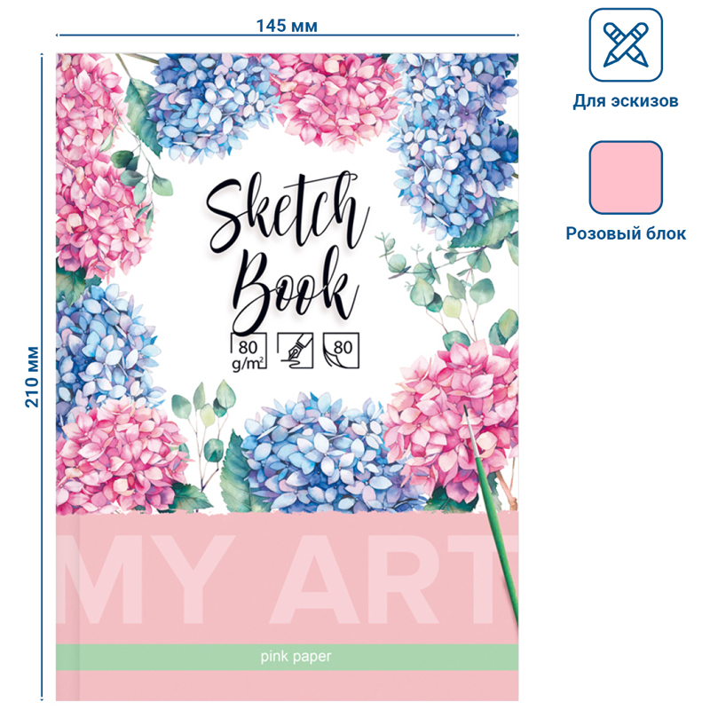 Скетчбук BG серии «Цветущая гортензия» удобного формата А5 и размера 151*211 мм со стильным нежным изображением цветов является прекрасным помощником в создании эскизов и быстрых набросков. Твёрдая обложка (7БЦ) выполнена из картона с матовой ламинацией. Внутренний блок состоит из 80 нелинованных розовых пастельных тонированных листов офсетной бумаги плотностью 80 г/кв. м. Прошитый блок делает использование тетради для эскизов комфортным и надёжным. Все рисунки и записи будут храниться в одном месте. • Формат: А5; • Размер: 151*211 мм; • Количество листов: 80; • Внутренний блок: офсетная бумага; • Плотность блока: 80 г/кв. м; • Материал обложки: твёрдый картон; • Тип скрепления: сшивка.