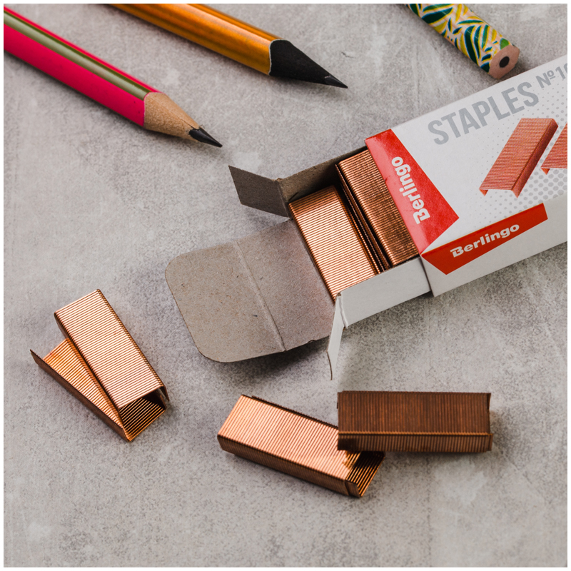 Скобы канцелярские № 10 Berlingo медные подойдут для скрепления листов бумаги. Скобы для степлера упакованы в картонную коробочку по 1000 штук. Канцелярские скобы изготовлены из стальной проволоки с медным покрытием, обеспечивают надёжное сшивание до 20 листов. • Количество: 1000 штук; • № скобы: 10; • Покрытие: медное; • Количество скрепляемых листов: до 20