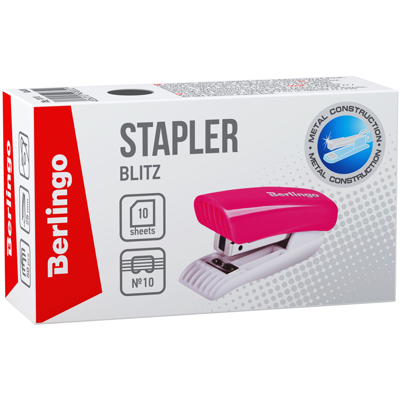 Канцелярский мини-степлер Berlingo Blitz прекрасно подходит для ежедневного использования. Степлер вмещает 50 скоб размером №10, имеет 1 тип скрепления. Сшивает до 10 листов. Глубина захвата – 25 мм. Оснащён встроенным антистеплером.