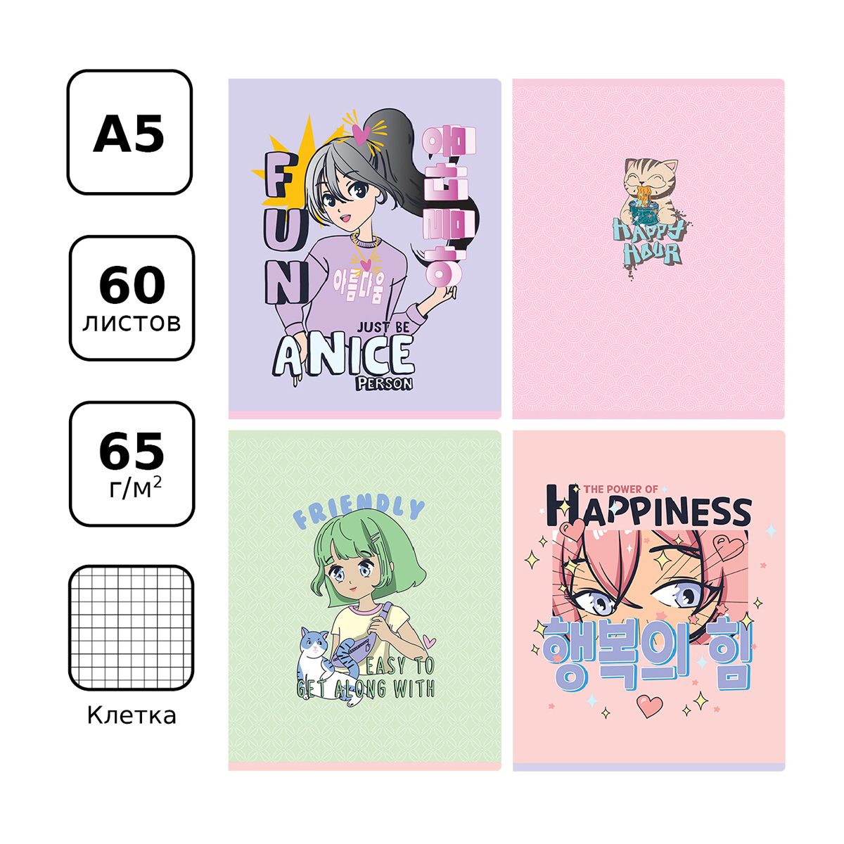 Тетрадь BG серии Лучшие друзья. Формат А5 (165*205 мм). Вид крепления – скрепка. Внутренний блок – это 60 листов, офсетная бумага плотностью 65 г/м². Обложка выполнена из мелованного картона. Тетради с современным дизайном, выполненным в стиле аниме, отлично подходят для выполнения домашних и контрольных работ. • Кол-во листов: 60 л; • Линовка: клетка; • Белизна: 100%; • Плотность блока: 65 г/м²; • Материал обложки: мелованный картон.