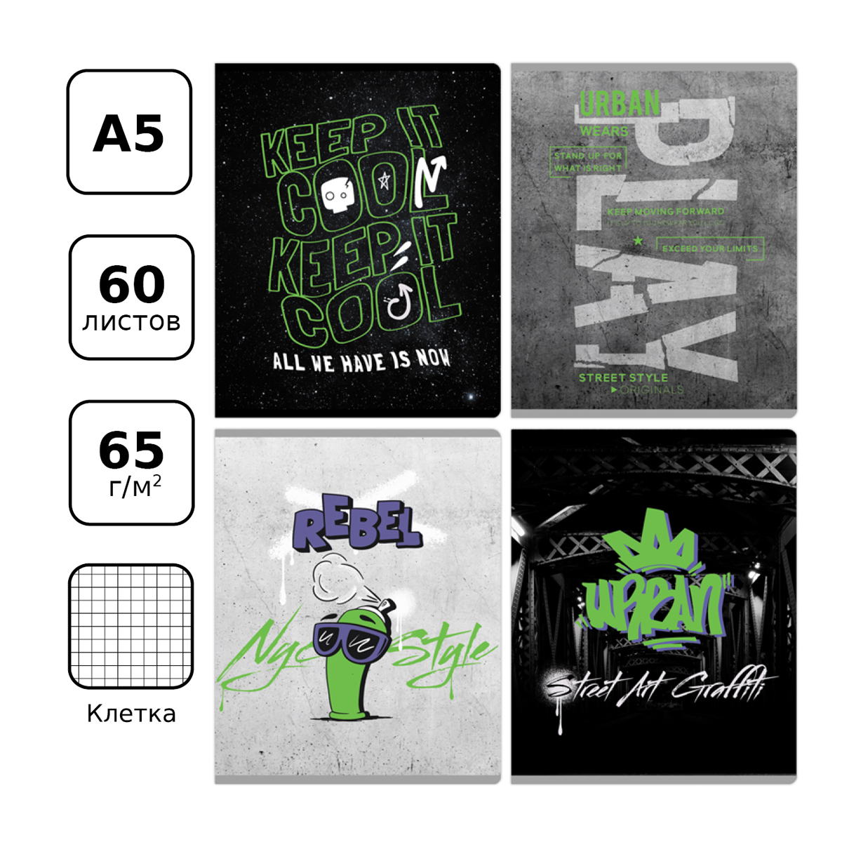 Тетрадь BG серии Urban art в клетку. Формат А5. Вид крепления – скрепка. Внутренний блок – это 60 листов, офсетная бумага плотностью 65 г/м². Обложка выполнена из мелованного картона с печатью неоновым пантоном. Тетради с современным молодежным дизайном отлично подходят для выполнения домашних и контрольных работ. • Кол-во листов: 60 л; • Линовка: клетка; • Белизна: 100%; • Плотность блока: 65 г/м²; • Крепление: скрепка; • Материал обложки: мелованный картон.