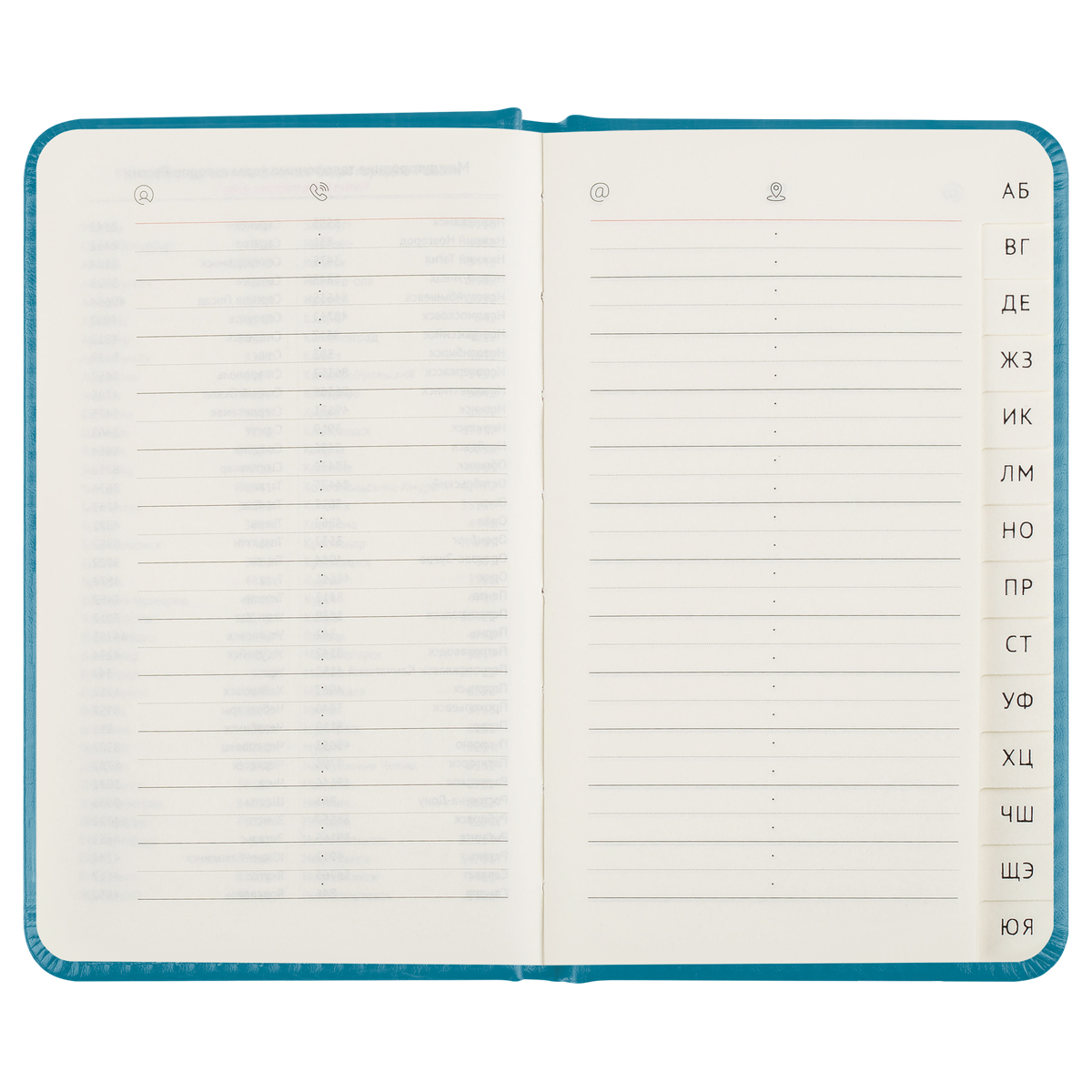 Телефонная книга BG формата А7 серии "Winner. Dark teal" в твёрдой обложке бирюзового цвета, выполненной из высококачественной экокожи с гладкой матовой поверхностью и поролоновой прослойкой. Вырубной алфавитный блок состоит из 64 листов офсетной бумаги плотностью 70 г/м2 с печатью в 2 краски. Телефонная книга представлена в размере 82*132 мм. В телефонной книге предусмотрен календарь и справочная информация. Индивидуальная упаковка в термоусадочную пленку. BG – с вами с 2001 года! • Формат: А7; • Размер: 82*132 мм; • Количество листов: 64; • Материал обложки: экокожа; • Цвет обложки: бирюзовый.