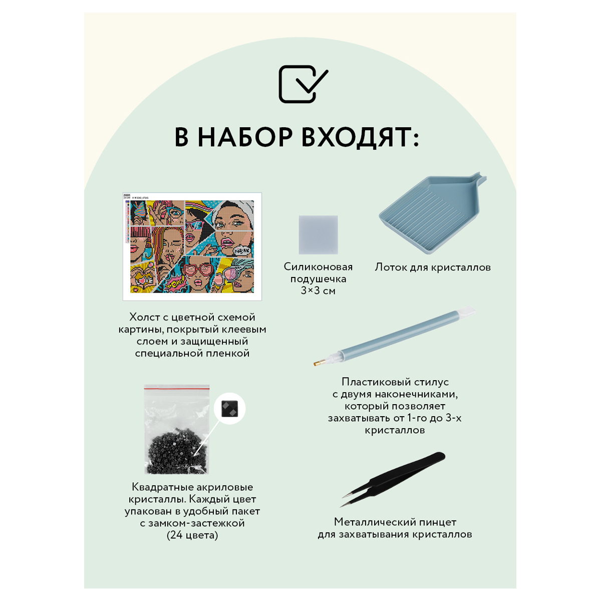 Алмазная мозаика - увлекательное занятие, которое дарит умиротворение и гармонию, развивает усидчивость, аккуратность и внимательность. Вы сможете создать своими руками оригинальную, мерцающую на свету картину. В набор входят: • холст с цветной схемой картины, покрытый клеевым слоем и защищенный специальной пленкой; • квадратные акриловые кристаллы. Каждый цвет упакован в удобный пакет с замком-застежкой; • металлический пинцет для захватывания кристаллов; • пластиковый стилус с 2 наконечниками, который позволяет захватывать от 1 до 3 кристаллов; • силиконовая подушечка; • лоток для кристаллов. Количество цветов: 24 Уровень сложности: 5