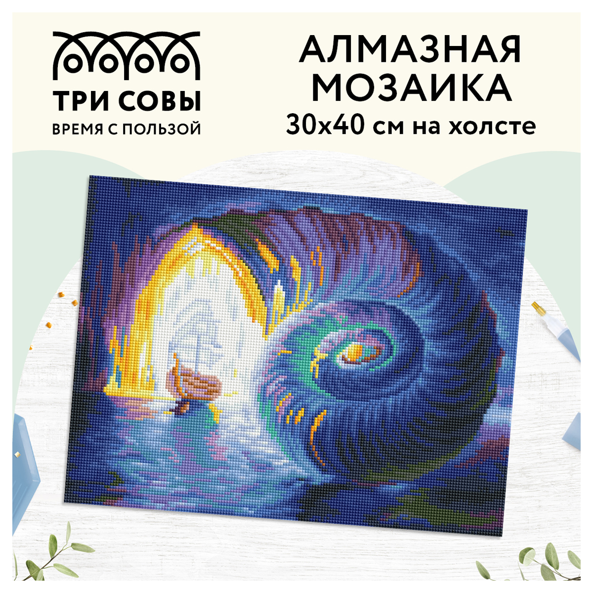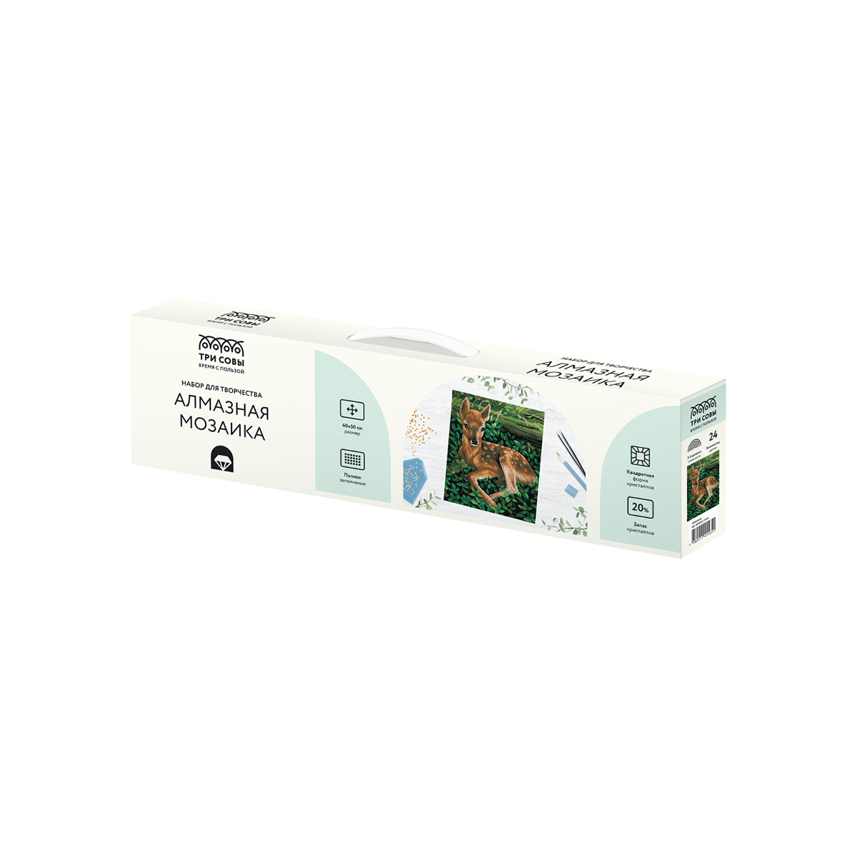 Создание картины из алмазной мозаики «ТРИ СОВЫ» – увлекательное занятие, которое дарит умиротворение и гармонию, развивает усидчивость, аккуратность и внимательность. Вы сможете создать своими руками оригинальную, мерцающую на свету картину. В набор «Оленёнок» входят: • холст 40*50 см с цветной схемой картины, покрытый клеевым слоем и защищенный специальной плёнкой; • квадратные акриловые кристаллы (каждый цвет упакован в удобный пакет с замком-застежкой); • металлический пинцет для захватывания кристаллов; • пластиковый стилус с 2 наконечниками, который позволяет захватывать от 1 до 3 кристаллов; • силиконовая подушечка; • лоток для кристаллов. «ТРИ СОВЫ» – время с пользой! • Тематика: животные; • Количество цветов: 24; • Уровень сложности: 5.
