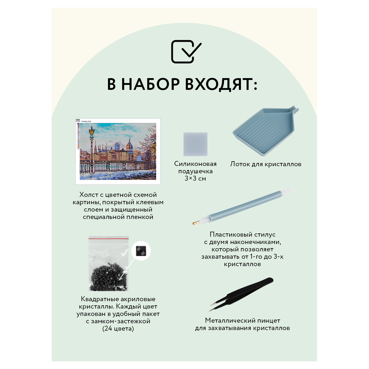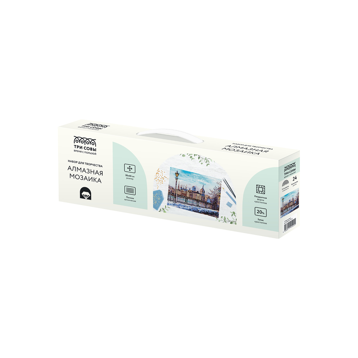 Создание картины из алмазной мозаики «ТРИ СОВЫ» – увлекательное занятие, которое дарит умиротворение и гармонию, развивает усидчивость, аккуратность и внимательность. Вы сможете создать своими руками оригинальную, мерцающую на свету картину. В набор «Старый город» входят: • холст с цветной схемой картины, покрытый клеевым слоем и защищенный специальной плёнкой; • квадратные акриловые кристаллы (каждый цвет упакован в удобный пакет с замком-застежкой); • металлический пинцет для захватывания кристаллов; • пластиковый стилус с 2 наконечниками, который позволяет захватывать от 1 до 3 кристаллов; • силиконовая подушечка; • лоток для кристаллов. «ТРИ СОВЫ» – время с пользой! • Тематика: городской; • Количество цветов: 24; • Уровень сложности: 5.