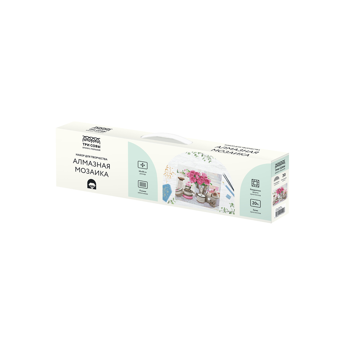 Создание картины из алмазной мозаики «ТРИ СОВЫ» – увлекательное занятие, которое дарит умиротворение и гармонию, развивает усидчивость, аккуратность и внимательность. Вы сможете создать своими руками оригинальную, мерцающую на свету картину. В набор «Розы и кружево» входят: • холст 40*50 см с цветной схемой картины, покрытый клеевым слоем и защищенный специальной плёнкой; • квадратные акриловые кристаллы (каждый цвет упакован в удобный пакет с замком-застежкой); • металлический пинцет для захватывания кристаллов; • пластиковый стилус с 2 наконечниками, который позволяет захватывать от 1 до 3 кристаллов; • силиконовая подушечка; • лоток для кристаллов. «ТРИ СОВЫ» – время с пользой! • Тематика: цветы; • Количество цветов: 30; • Уровень сложности: 5.