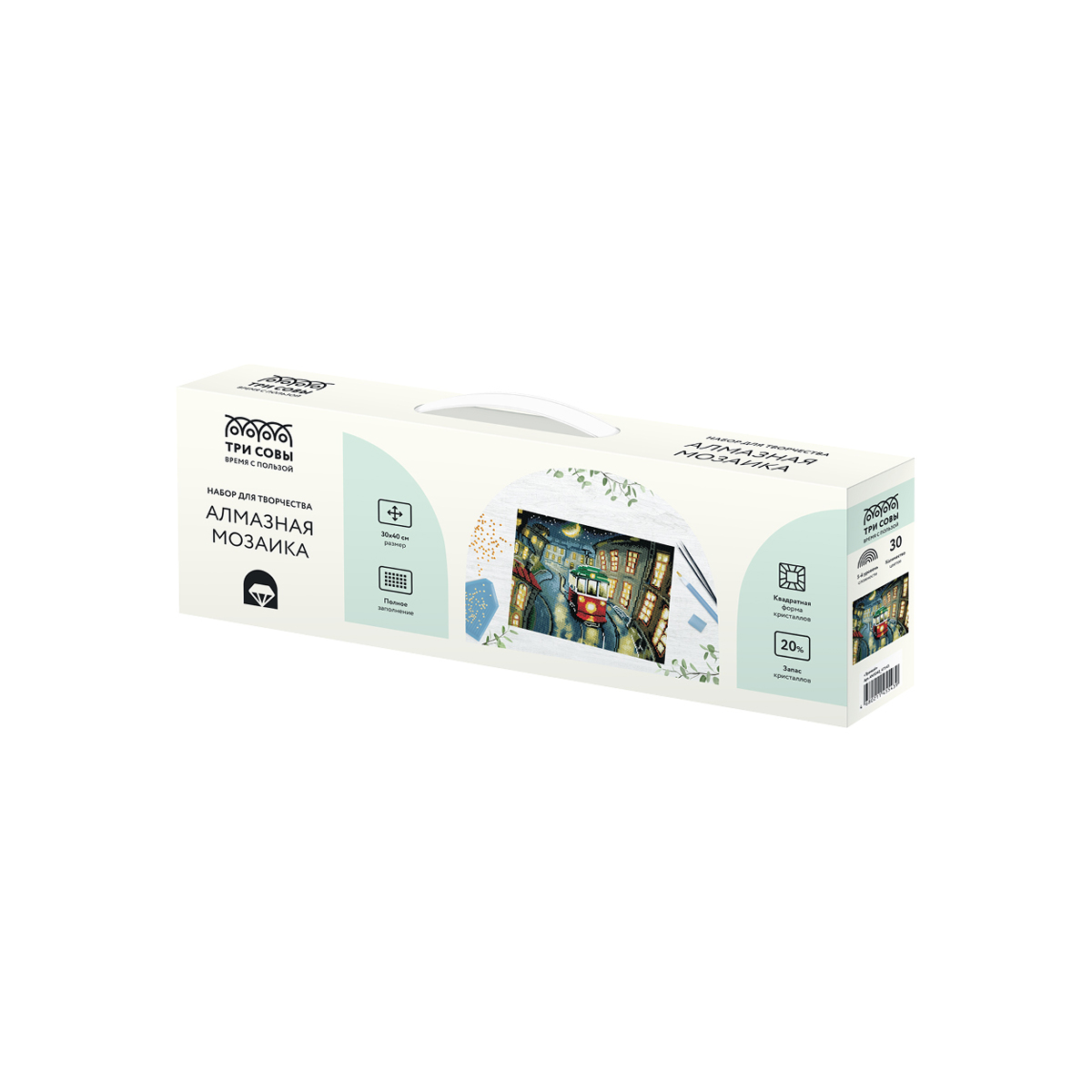 Создание картины из алмазной мозаики «ТРИ СОВЫ» – увлекательное занятие, которое дарит умиротворение и гармонию, развивает усидчивость, аккуратность и внимательность. Вы сможете создать своими руками оригинальную, мерцающую на свету картину. В набор «Трамвай» входят: • холст с цветной схемой картины, покрытый клеевым слоем и защищенный специальной плёнкой; • квадратные акриловые кристаллы (каждый цвет упакован в удобный пакет с замком-застежкой); • металлический пинцет для захватывания кристаллов; • пластиковый стилус с 2 наконечниками, который позволяет захватывать от 1 до 3 кристаллов; • силиконовая подушечка; • лоток для кристаллов. «ТРИ СОВЫ» – время с пользой! • Тематика: транспорт; • Количество цветов: 30; • Уровень сложности: 5.