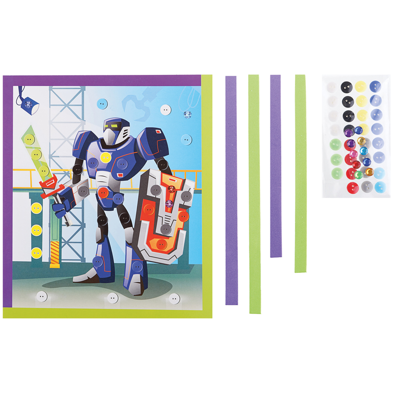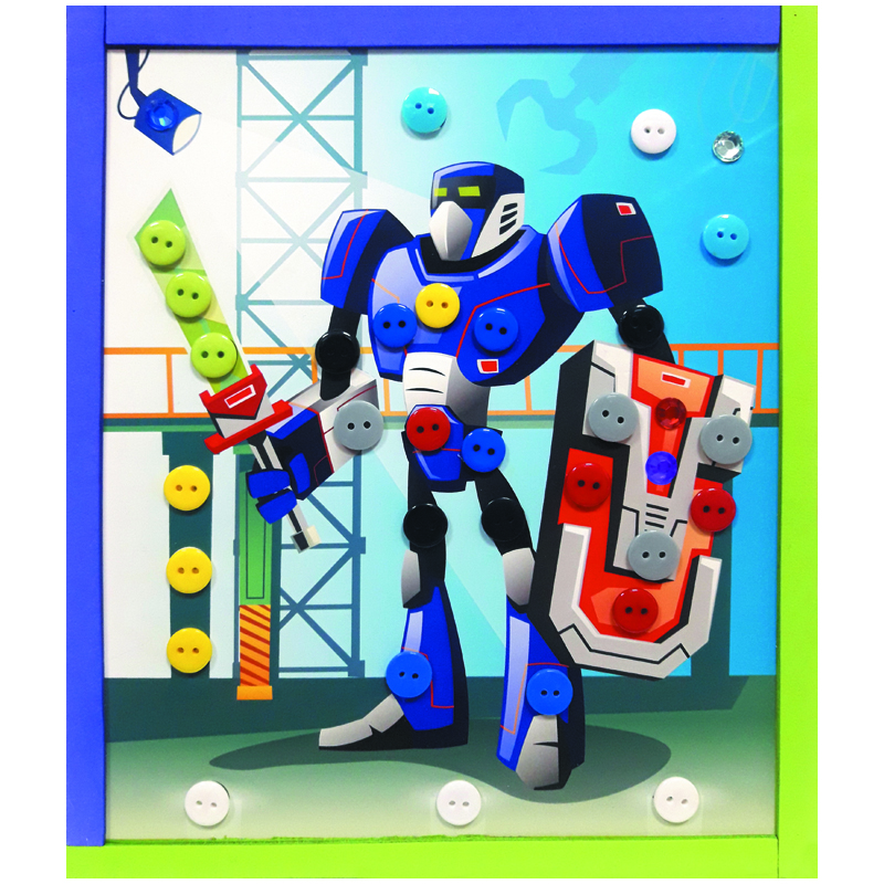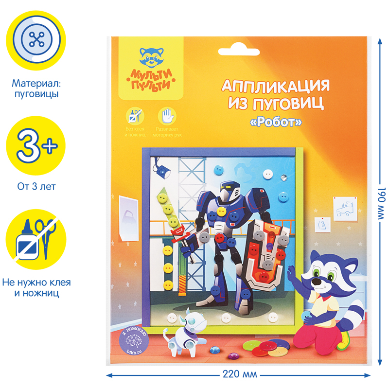 Аппликация из пуговиц «Мульти-Пульти» «Робот» – прекрасное средство развития воображения, аккуратности и терпения у ребенка, а также мелкой моторики, внимания и мышления. С её помощью можно создать доступную и интересную поделку и провести время с пользой. Она предназначена для детей старше трёх лет. Кто, как не юные непоседы, любят создавать свои первые маленькие шедевры. Так они удовлетворяют потребность в реализации идей и развитии творческого начала. При создании аппликации не требуются ножницы или клей, что упрощает работу над ней. Прекрасную картинку можно преподнести близким в качестве подарка на любое значимое событие. • Вид товара: набор для аппликации; • Тип аппликации: аппликация из фетра и пуговиц; • Размер: 19*22 см; • Материал для аппликации: пуговицы, фетр, EVA; основа: картон; • Пол: универсальный; • Возраст: от 3 лет.