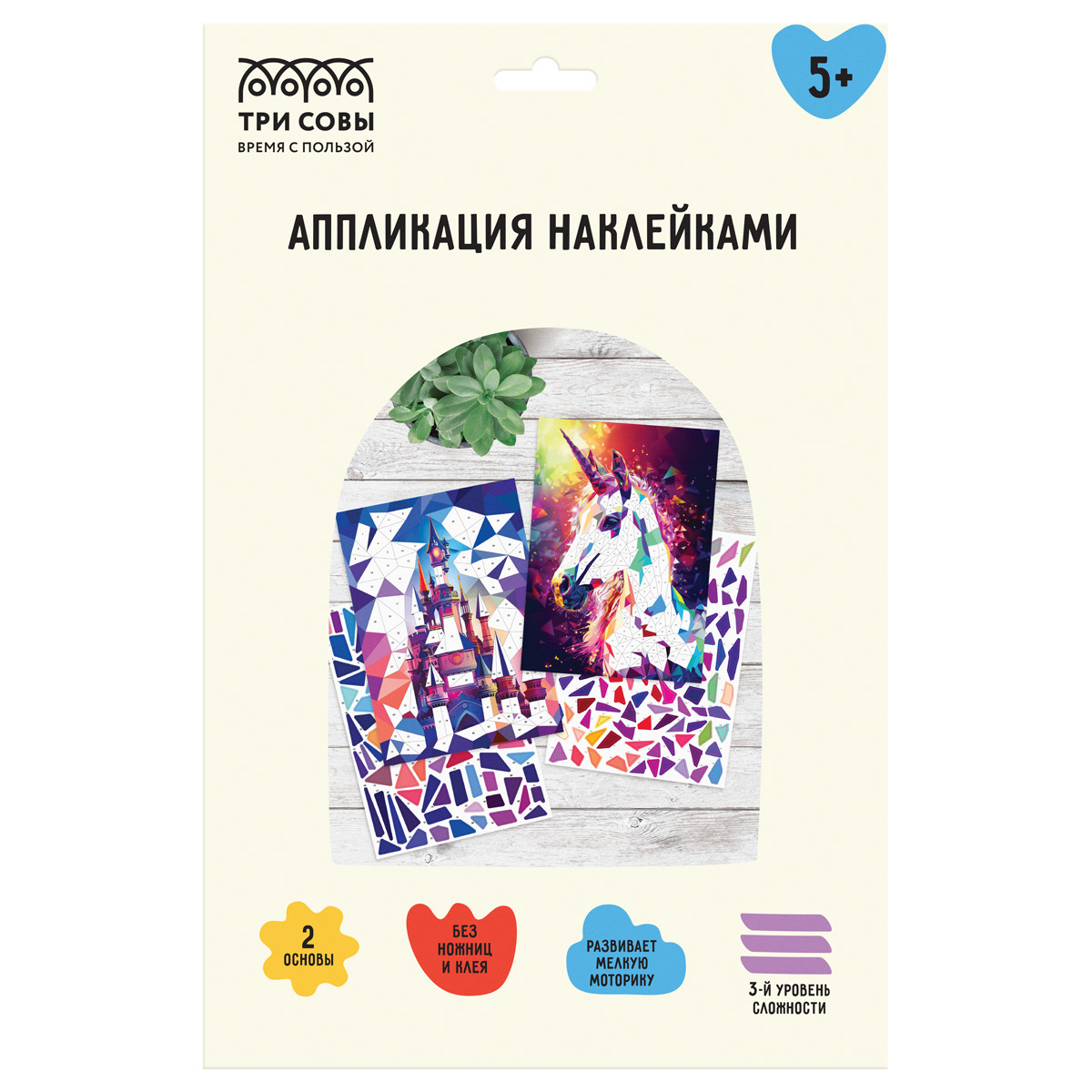 Набор для детского творчества «Аппликация наклейками» бренда «ТРИ СОВЫ» позволит ребенку с удовольствием и пользой провести время. Для создания аппликации «Волшебный мир» не потребуется клея и ножниц. В набор входят: - 2 основы для аппликации из плотного картона - 2 блока с наклейками Рекомендации по работе с набором: шаг 1 - подготовить рабочее место; шаг 2 - выбрать и отклеить элемент аппликации от блока с наклейками; шаг 3 - найти на основе-картинке область с такой же цифрой и приклеить элемент. Наклеенные на основу элементы создадут две яркие и интересные картины, которые можно подарить близкому человеку или украсить комнату. Работая с аппликацией, ребенок активно развивает мелкую моторику, восприятие цвета и формы, пространственное и образно-логическое мышление, концентрацию внимания. «ТРИ СОВЫ» – время с пользой!