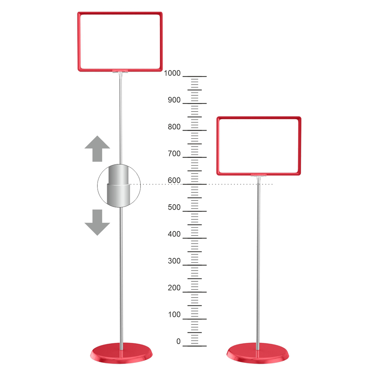 Универсальная телескопическая информационная стойка с круглым металлическим основанием. Возможно вертикальное и горизонтальное положение рамки, работает на две стороны. Адаптируется под любую высоту от 600 до 1000 мм с помощью телескопической трубки. Универсальное решение для экспресс - оформления витрин, акций.