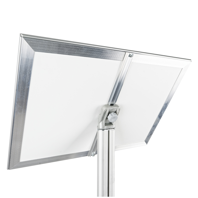 Перекидная демосистема на сером устойчивом основании. Благодаря углу наклона подходит, например, как стенд для меню. Демосистема рассчитана на 10 рамок формата А4.