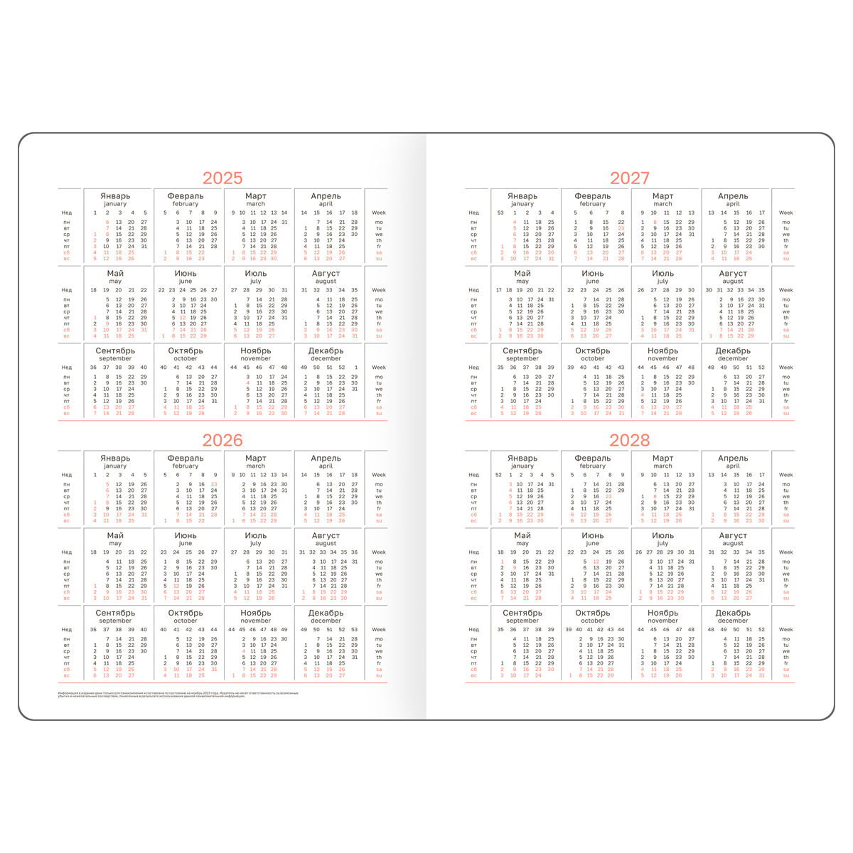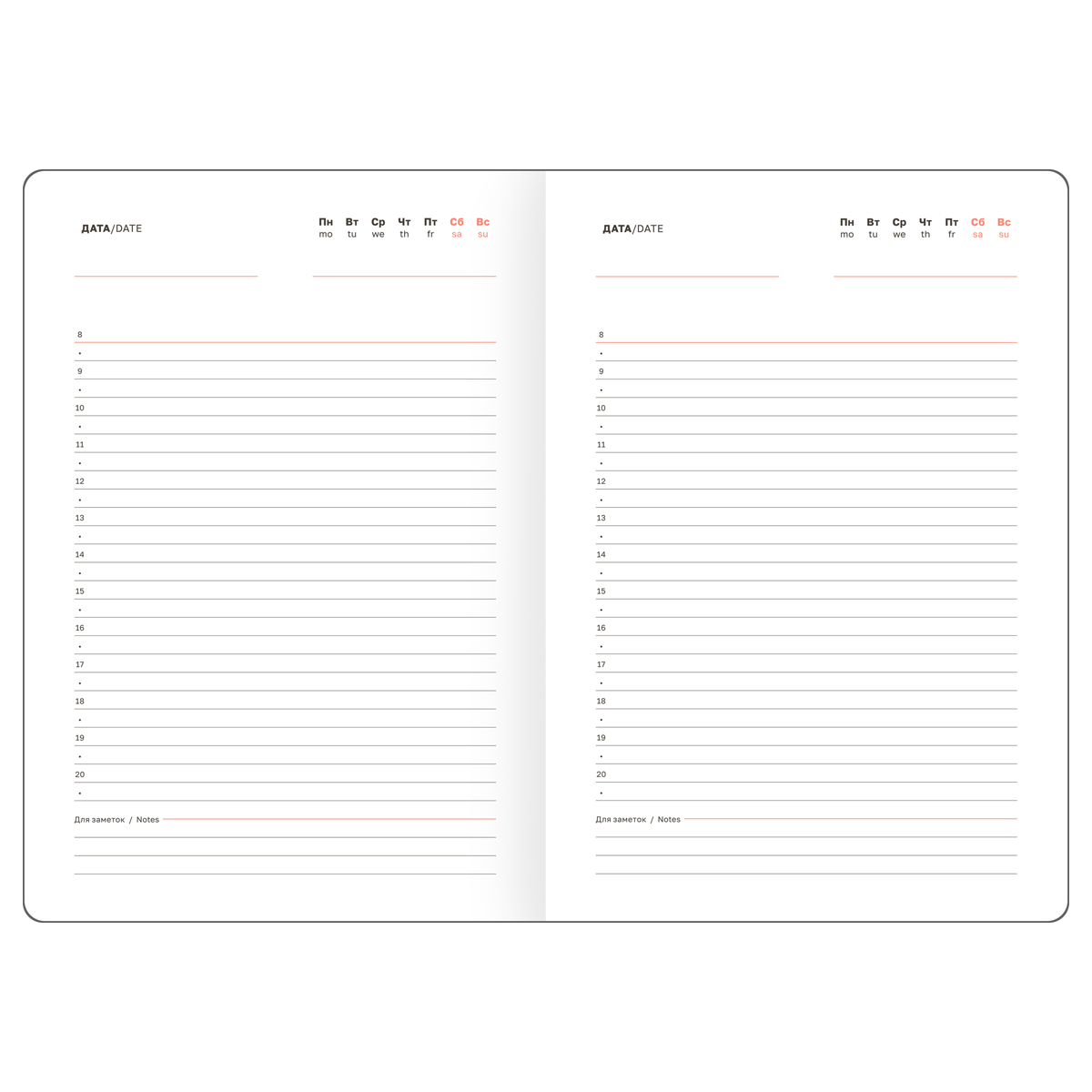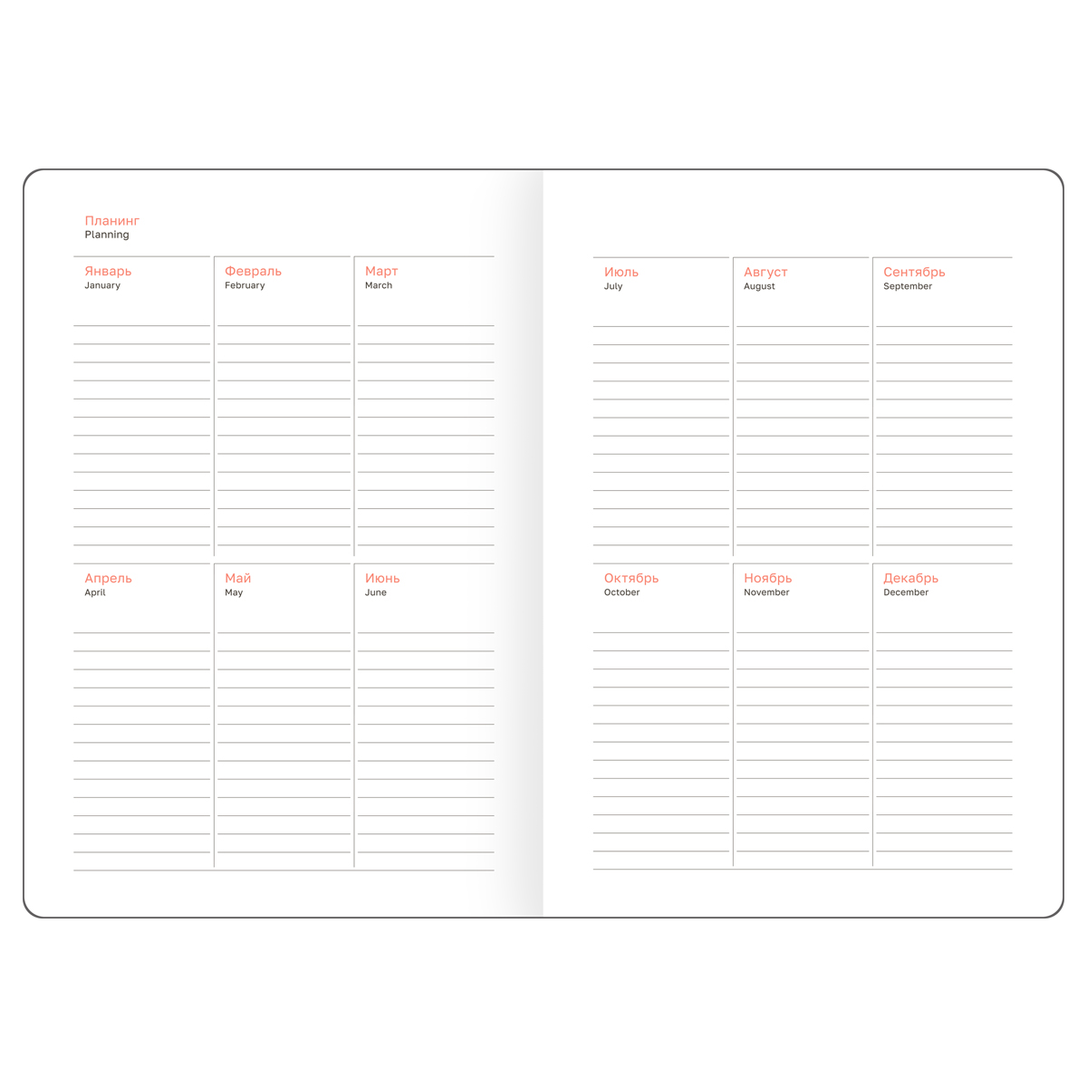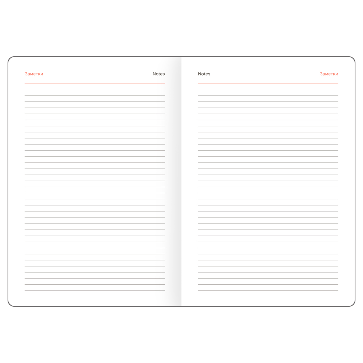 Изделие формата А5 (145*205 мм) состоит из 136 листов белой бумаги плотностью 70 г/м2, которая подходит для любых типов ручек и не будет просвечиваться. В линованный блок с полем для даты и почасовым планингом удобно записывать встречи, идеи и задачи. Уголки листов с перфорацией.