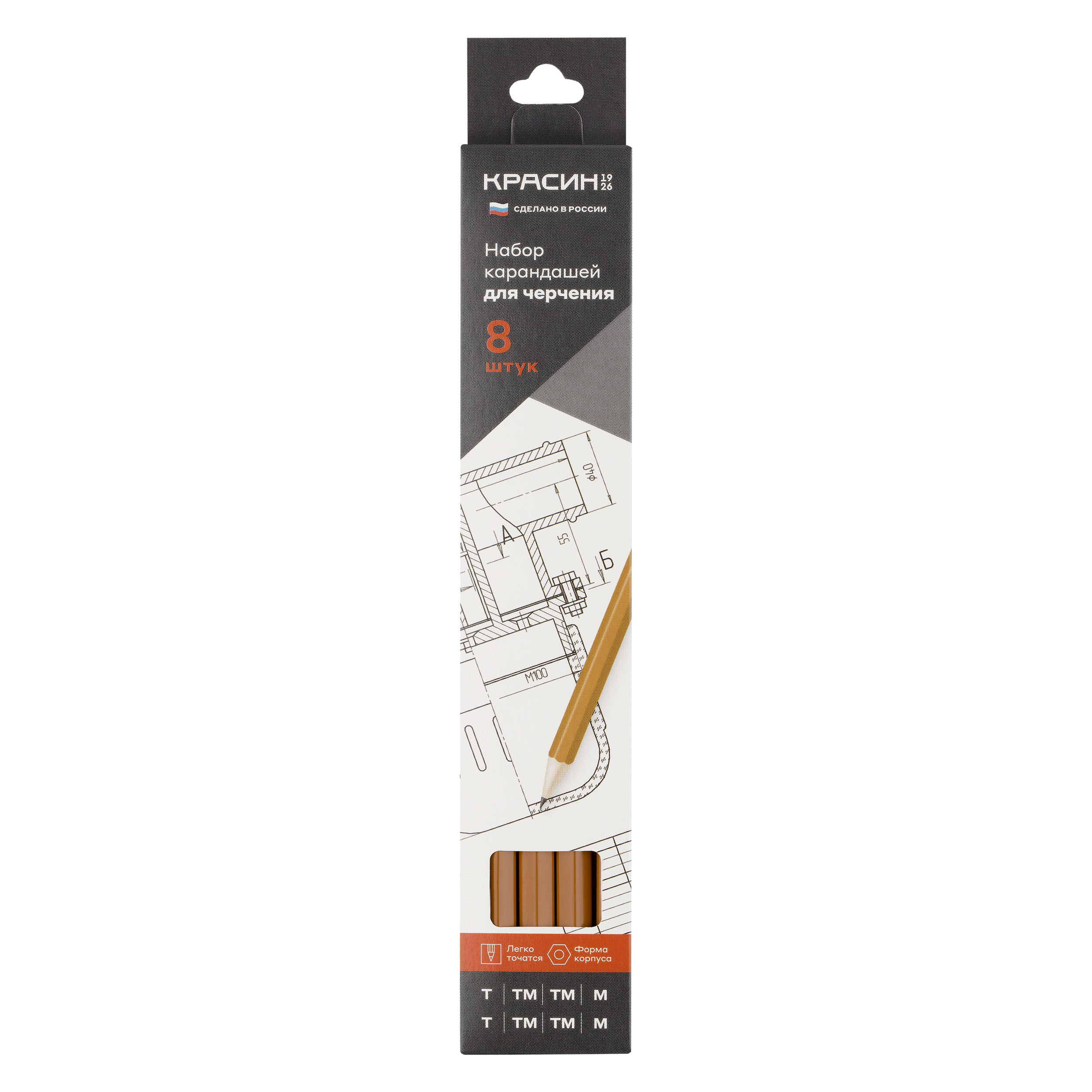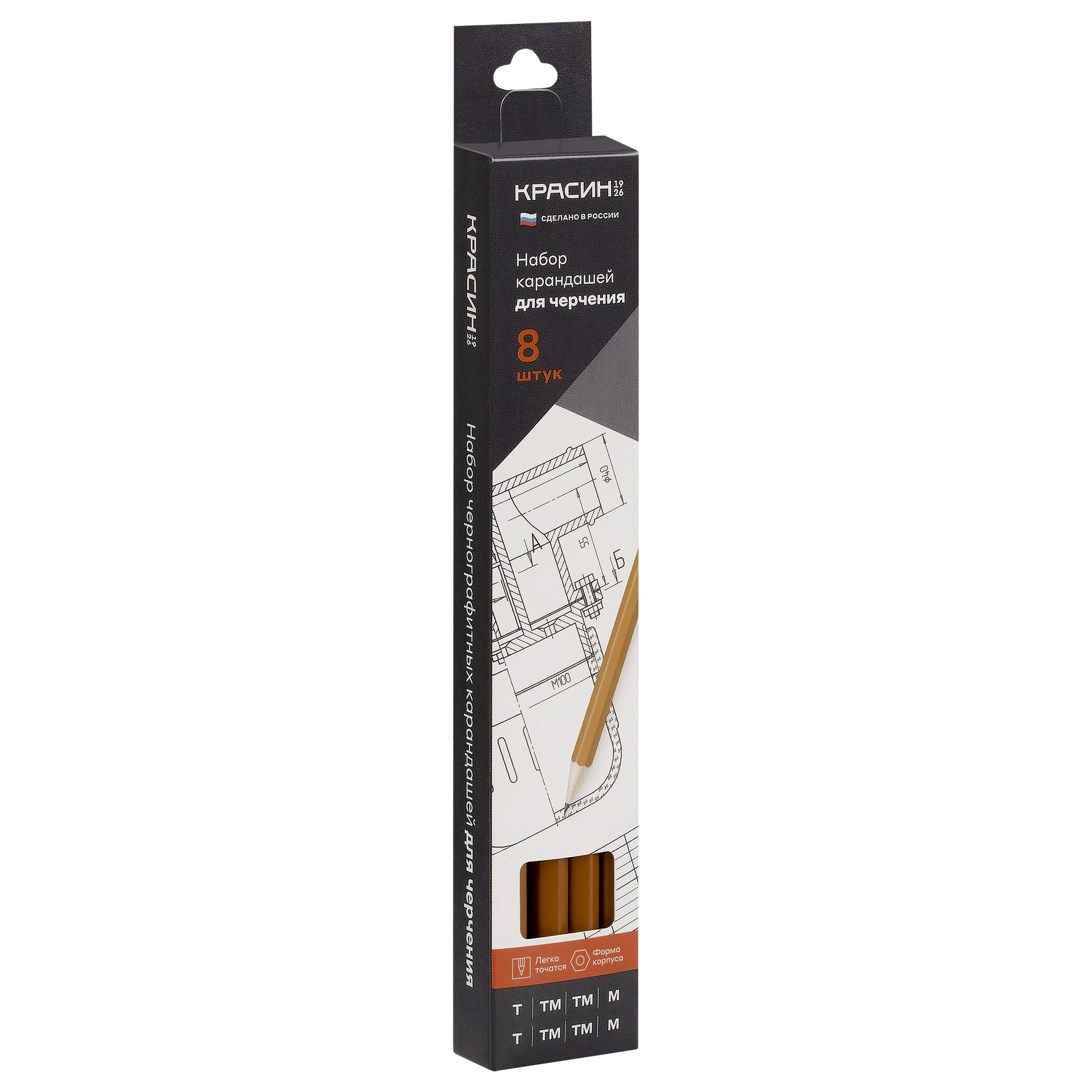 Набор карандашей ч/г Красин "Для черчения" 8шт., Н (Т)-2, НВ (ТМ)-4, В (М)-2, шестигран., заточен., карт. упаковка., европодвес КР-160800