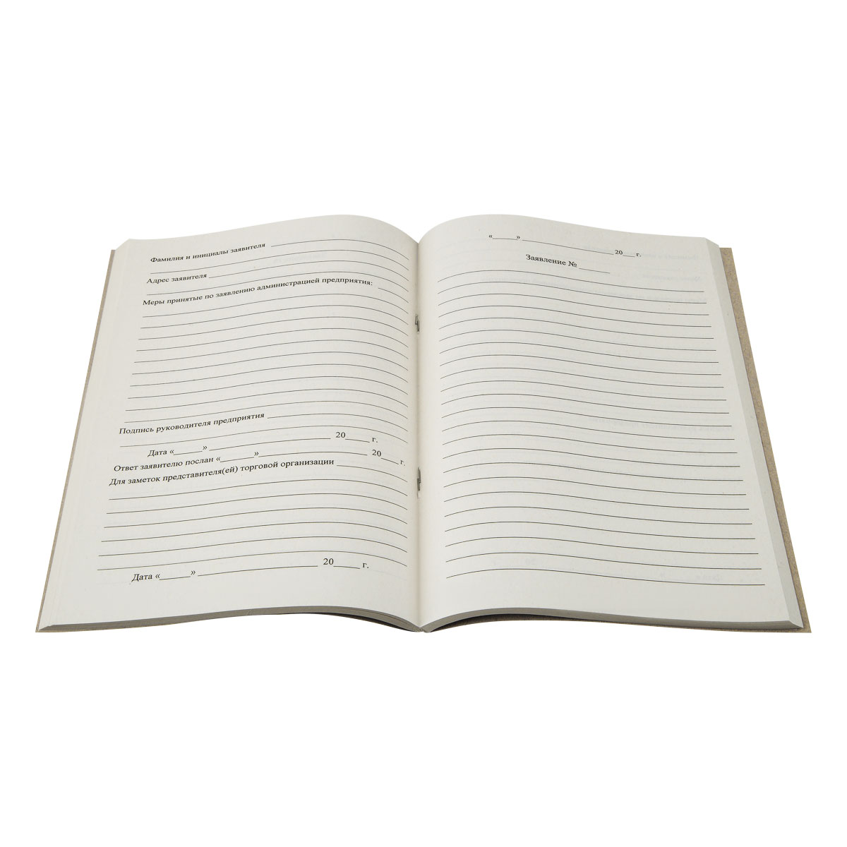 Книга отзывов и предложений. Обложка -мелованный картон плотностью 190 г/м2. Внутренний блок - писчая бумага 60 г/м2. Вид крепления -скрепка.
