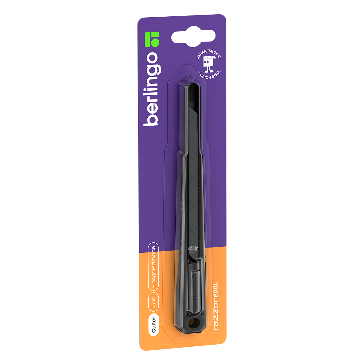 Серия "Razzor 200L". Нож канцелярский с системой автоматической фиксации лезвия auto-lock. Корпус ножа выполнен из высококачественного ABS пластика. Имеет металлические направляющие. Комплектуется износостойким лезвием из стали SK2 с углом 45°. Ширина лезвия - 9 мм. Индивидуальная упаковка - блистер с европодвесом. На оборотной стороне блистера есть перфорация для более удобного извлечения инструмента из упаковки.