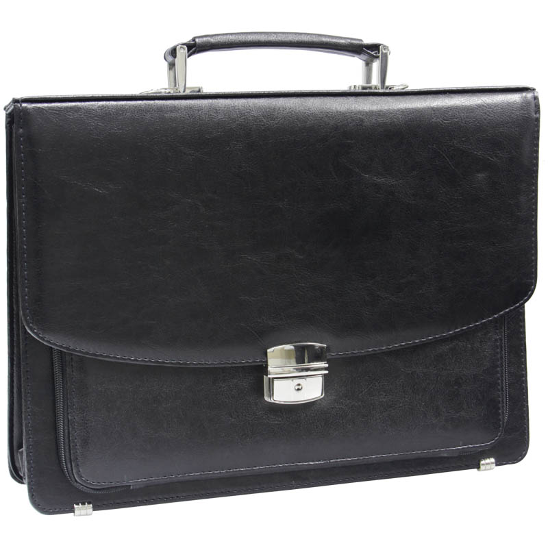 Деловой портфель из искусственной кожи. Закрывается с помощью крышки на замке-защелке. Внутри два отделения для хранения документов формата А4, а также два отделения хранения бумаг меньшего формата. Портфель имеет крепления для пишущих принадлежностей, а также внутреннее отделение-разделитель на молнии. Размер 360х270х70мм.