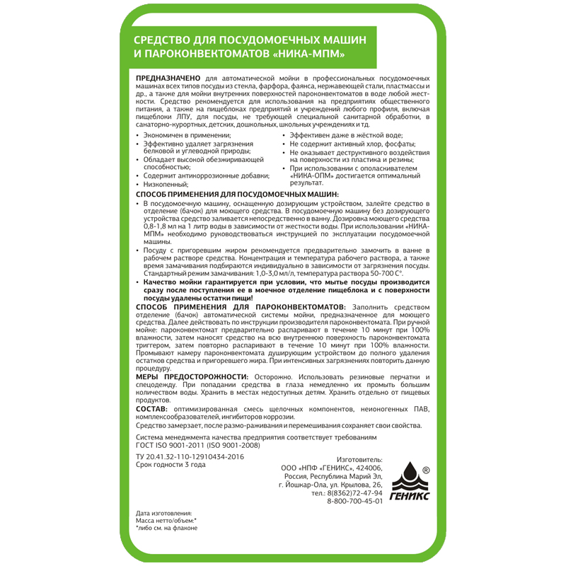 Средство предназначено для автоматической мойки в профессиональных посудомоечных машинах всех типов посуды из стекла, фарфора, фаянса, нержавеющей стали, пластмассы и др., а также для мойки внутренних поверхностей пароконвектоматов. Состав: оптимизированная смесь щелочных компонентов, только натуральные, биоразлагаемые ПАВ. Значение ph: щелочное. Способ применения для посудомоечных машин: 1) Профессиональных: дозировка моющего средства 0,8-1,8 мл на 1 литр воды в зависимости от жесткости воды; 2) Бытовых: добавить 30 мл в отсек для средства. Способ применения для пароконвектоматов: заполнить средством отделение (бачок) автоматической системы мойки, далее действовать по инструкции производителя. При использовании с ополаскивателем ""НИКА-ОПМ"" достигается оптимальный результат (коды в 1С - (279934,279936). Замерзает при -14С. При замораживании и размораживании свойства восстанавливаются.