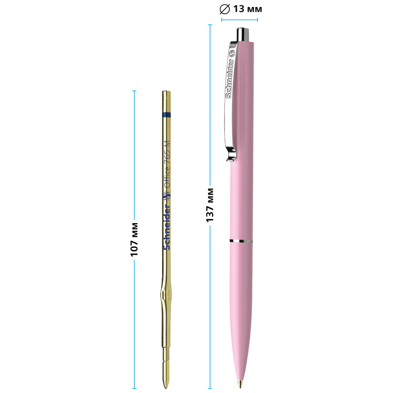Изящная автоматическая шариковая ручка с прочным металлическим клипом. Длина непрерывной линии - до 2 000 метров. Быстросохнущие, свето- и водоустойчивые чернила соответствуют международному стандарту качества ISO 12757-2 и отлично подходят для заполнения и подписи документов. Для замены подходят стержни Schneider Office 765 и Express 775.