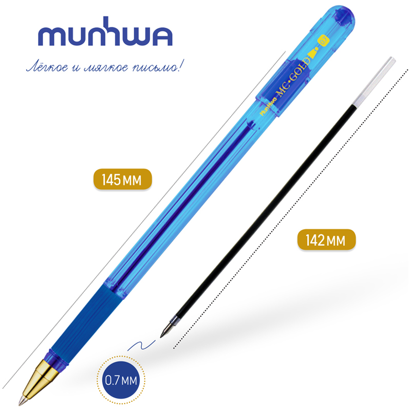 Ручка шариковая MunHwa "MC Gold" синяя, 0,7мм, грип, штрих-код BMC07-02