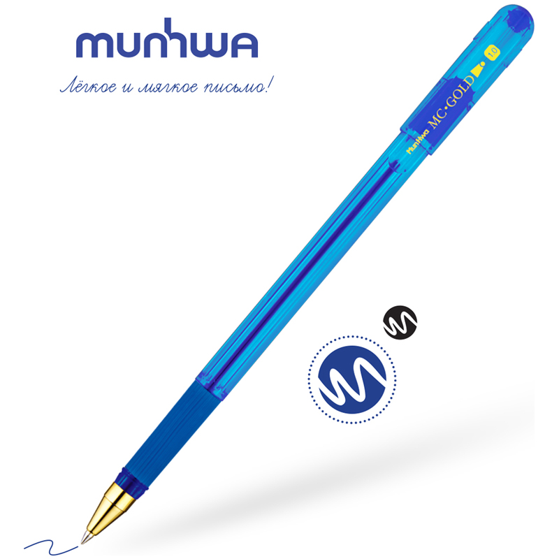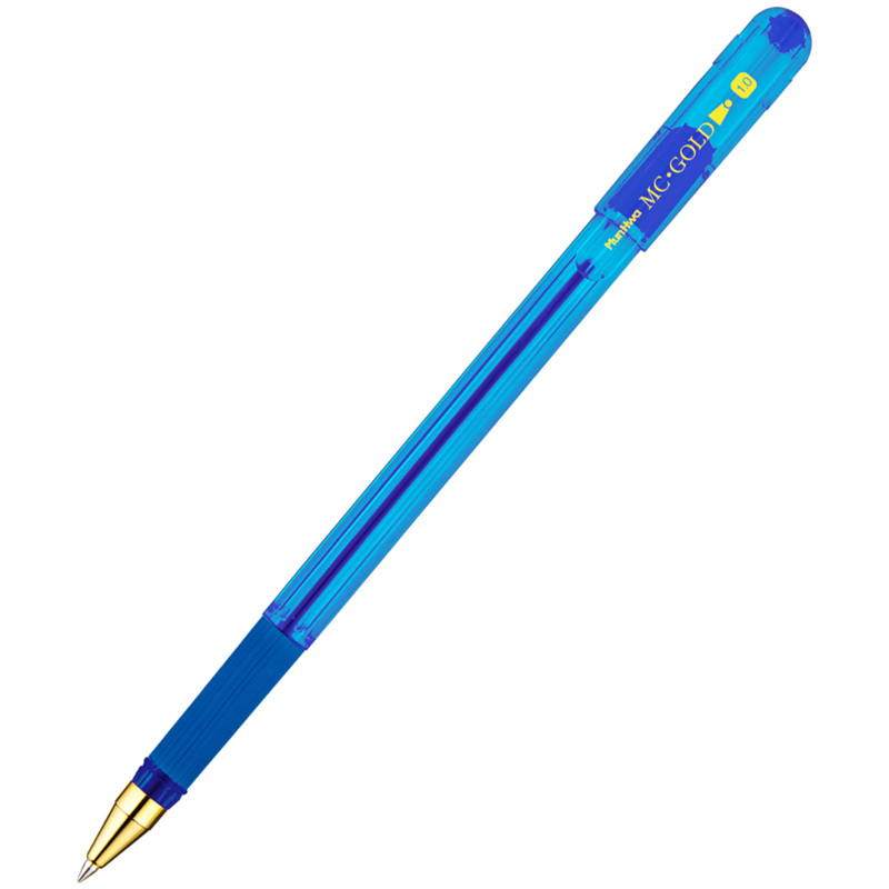 Длина линии письма более 1 200 метров. Цвет чернил - синий, диаметр пишущего узла - 1,0 мм. Упаковка: картонная коробка по 12 штук. MC Gold - идеальная ручка для комфортного письма.