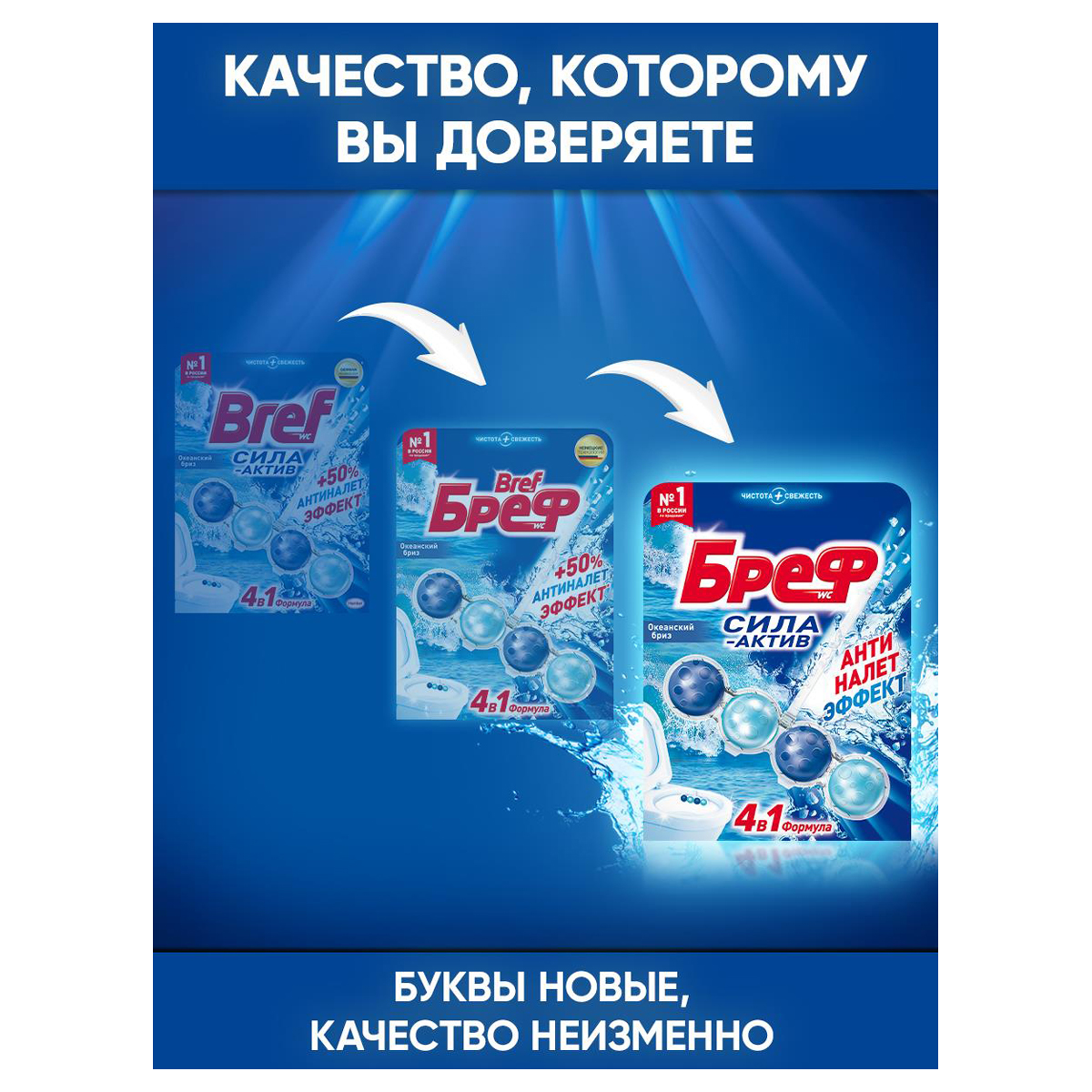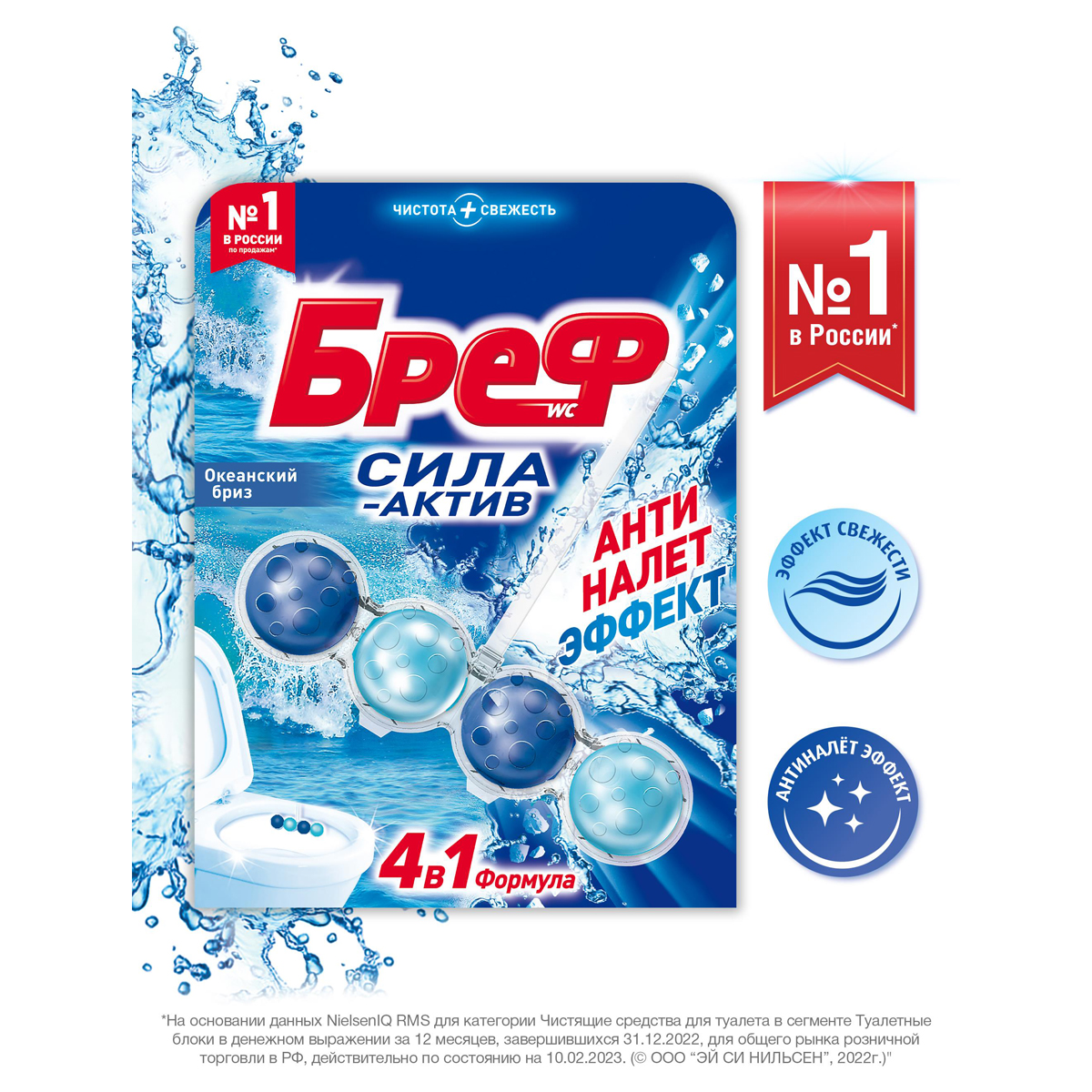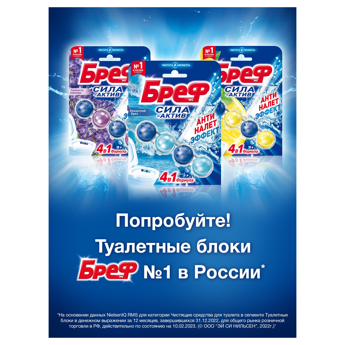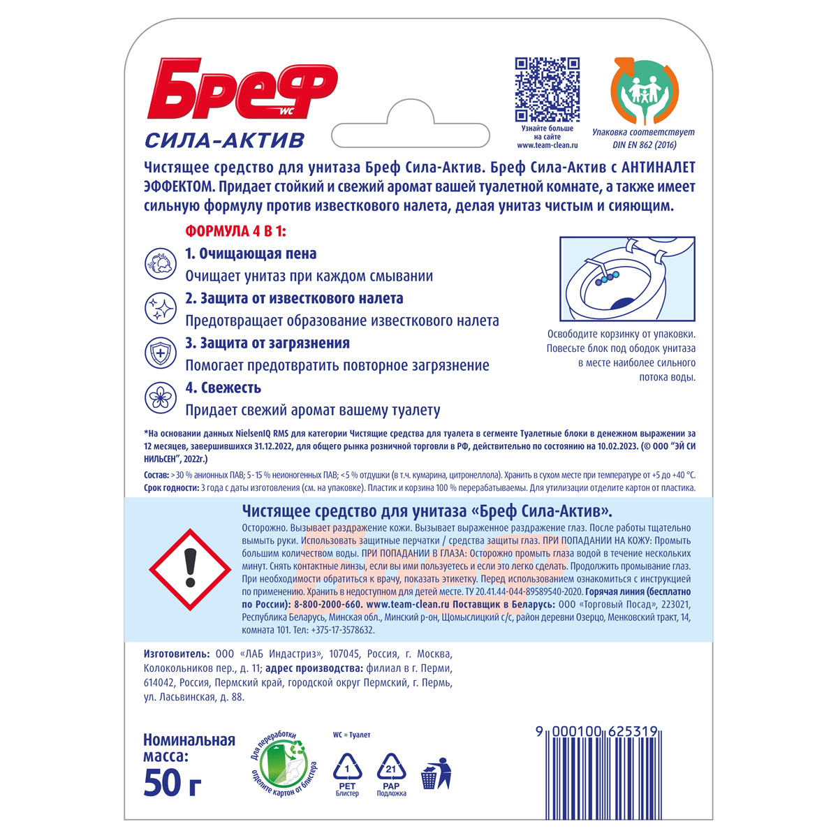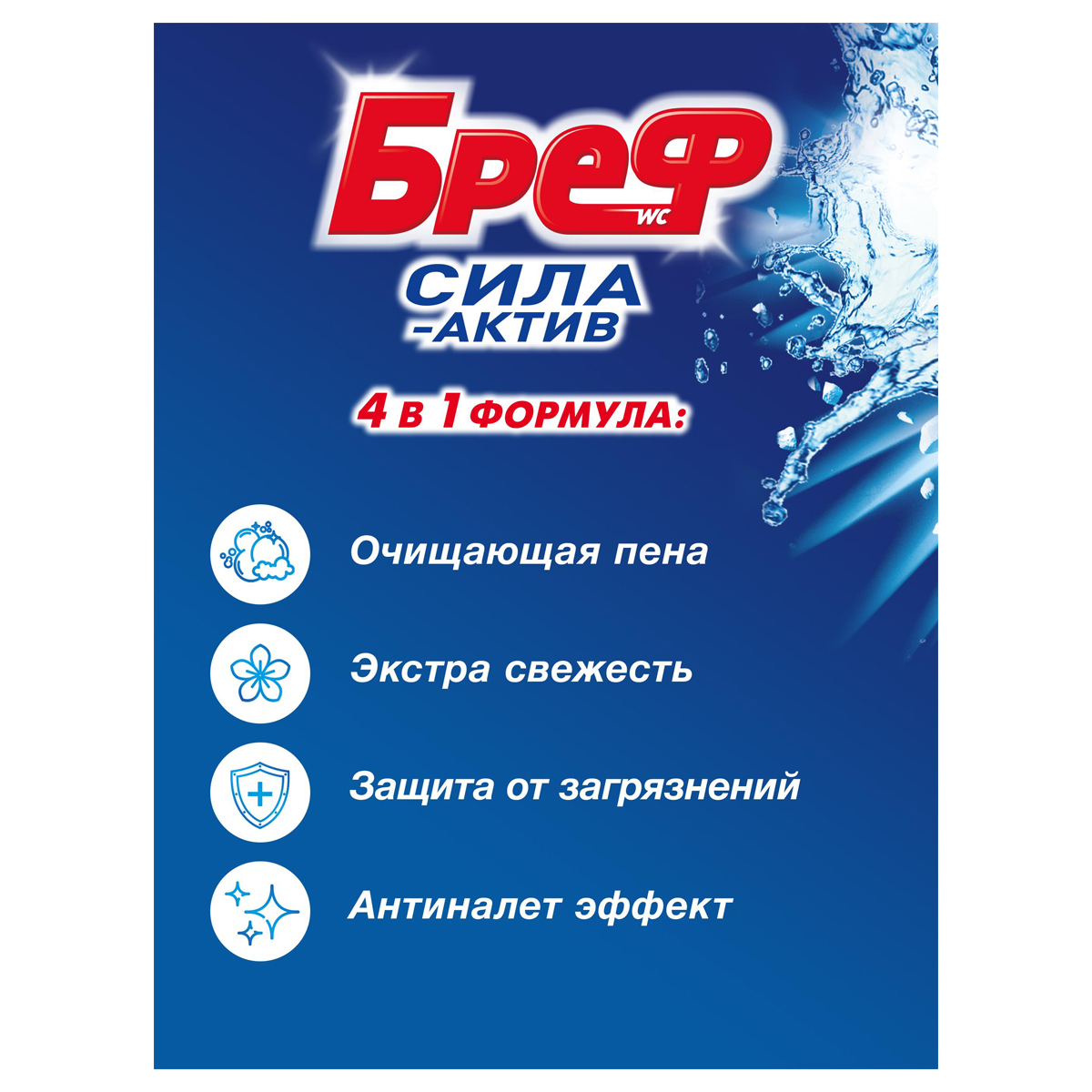 Bref Сила-Актив +50% АНТИНАЛЕТ ЭФФЕКТ* – подвесной туалетный блок с усиленной формулой против известкового налета. Активная формула с антиналет эффектом действует в 4 направлениях: • образует очищающую пену, которая обеспечивает гигиеническую чистоту; • предотвращает образование известкового налета; • помогает предотвратить повторное загрязнение; • придает туалетной комнате свежий аромат океана после каждого смывания. Bref Сила-Актив придает антиналет эффект при каждом смывании. *По сравнению с поверхностью без использования туалетного блока.