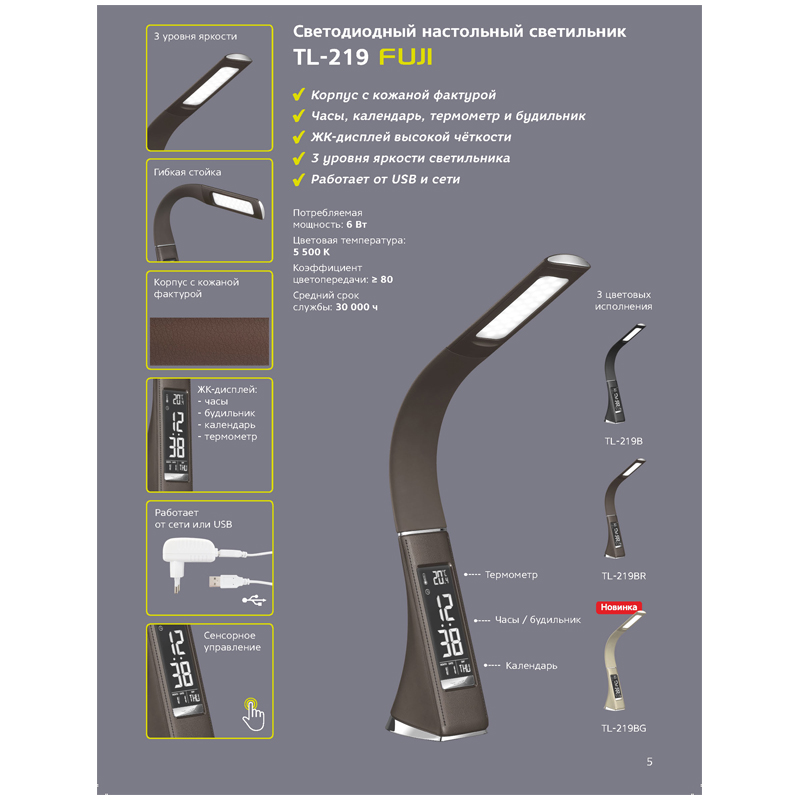 Три уровня яркости TL-219 для плодотворной работы. Это представитель интерьерных настольных ламп в стильном цветовом сочетании корпуса из материала с текстурой натуральной кожи. Вы привыкли к комфорту, удобству и безопасности? Предпочитаете их во всем даже, если дело касается организации рабочего места? Не пропустите самую важную деталь вашего стола - светодиодный светильник TL-219. Достойный выбор для максимального комфорта. TL-219 дает мягкое, приятное освещение, безопасное для зрения даже при длительной концентрации. Холодный дневной свет способствует концентрации внимания. Многочисленные исследования показали, что холодный дневной свет с цветовой температурой в 5500 K способствует повышению внимания, так как в таком случае освещение максимально приближено к естественному, и поддерживаются необходимые уровни энергии и концентрации. Светильник оснащен LED-дисплеем высокой четкости, так что вы всегда будете осведомлены о времени, дате и температуре окружающего воздуха. Светильни