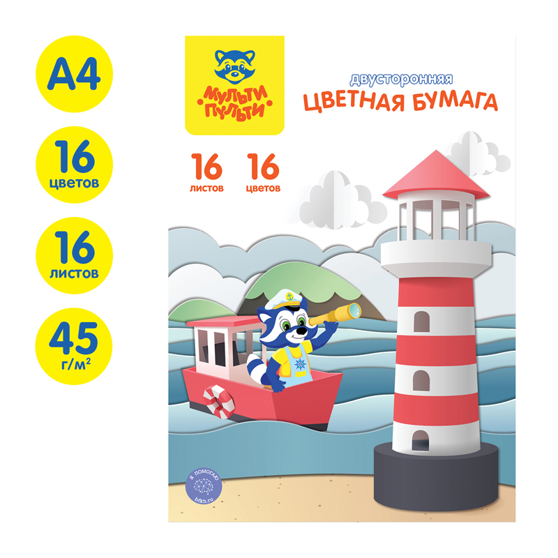 Цветная бумага офсетная A4, Мульти-Пульти, 16л., 16цв., на скобе, "Приключения Енота" БЦо16-16_31584
