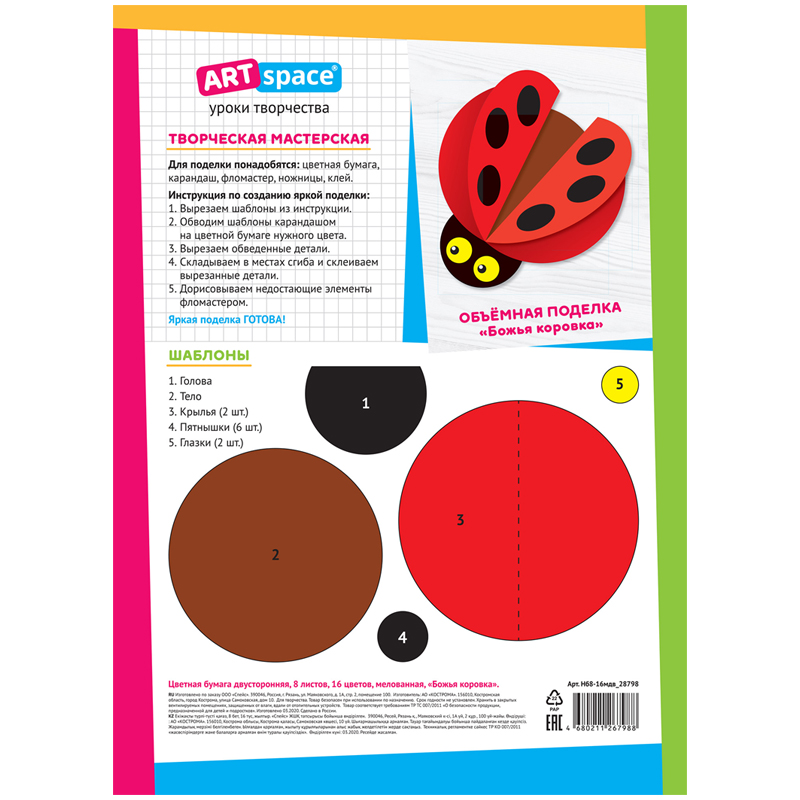 Набор цветной двусторонней бумаги ArtSpace «Божья коровка» идеально подойдет для создания красочных аппликаций, изготовления открыток и поделок. Рекомендована для уроков труда и технологии. Она имеет размер 200*275 мм. Плотность бумаги формата А4 – 55 г/м2. В наборе представлено 8 ярких цветов двусторонней мелованной бумаги на 8 листах. Цветная бумага прекрасно подойдет детям для развития моторики и фантазии ребенка. Обложка набора изготовлена из мелованной бумаги, на ней изображён интересный вариант поделки. Тип скрепления – 2 скобы. Транспортная упаковка – крафт-бумага по 50шт. • Количество листов: 8; • Количество цветов: 8; • Плотность бумаги: 55 г/м2; • Размер: 200*275 мм